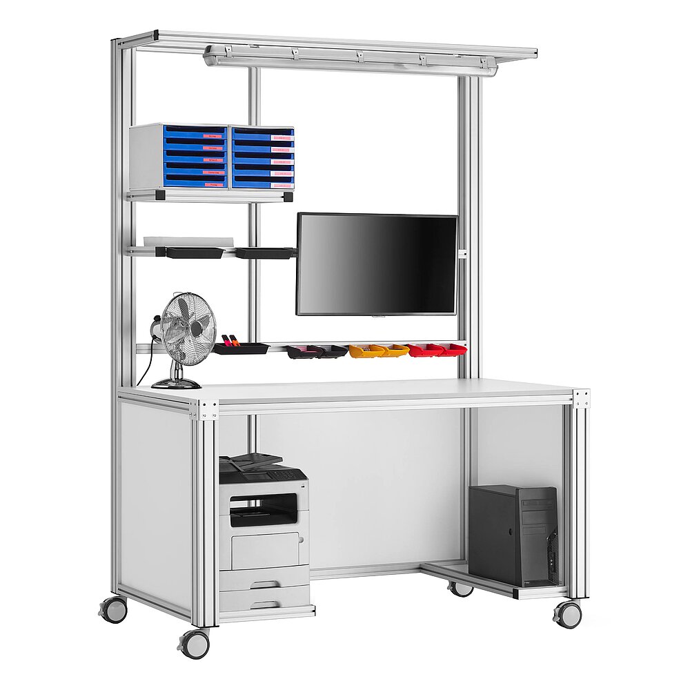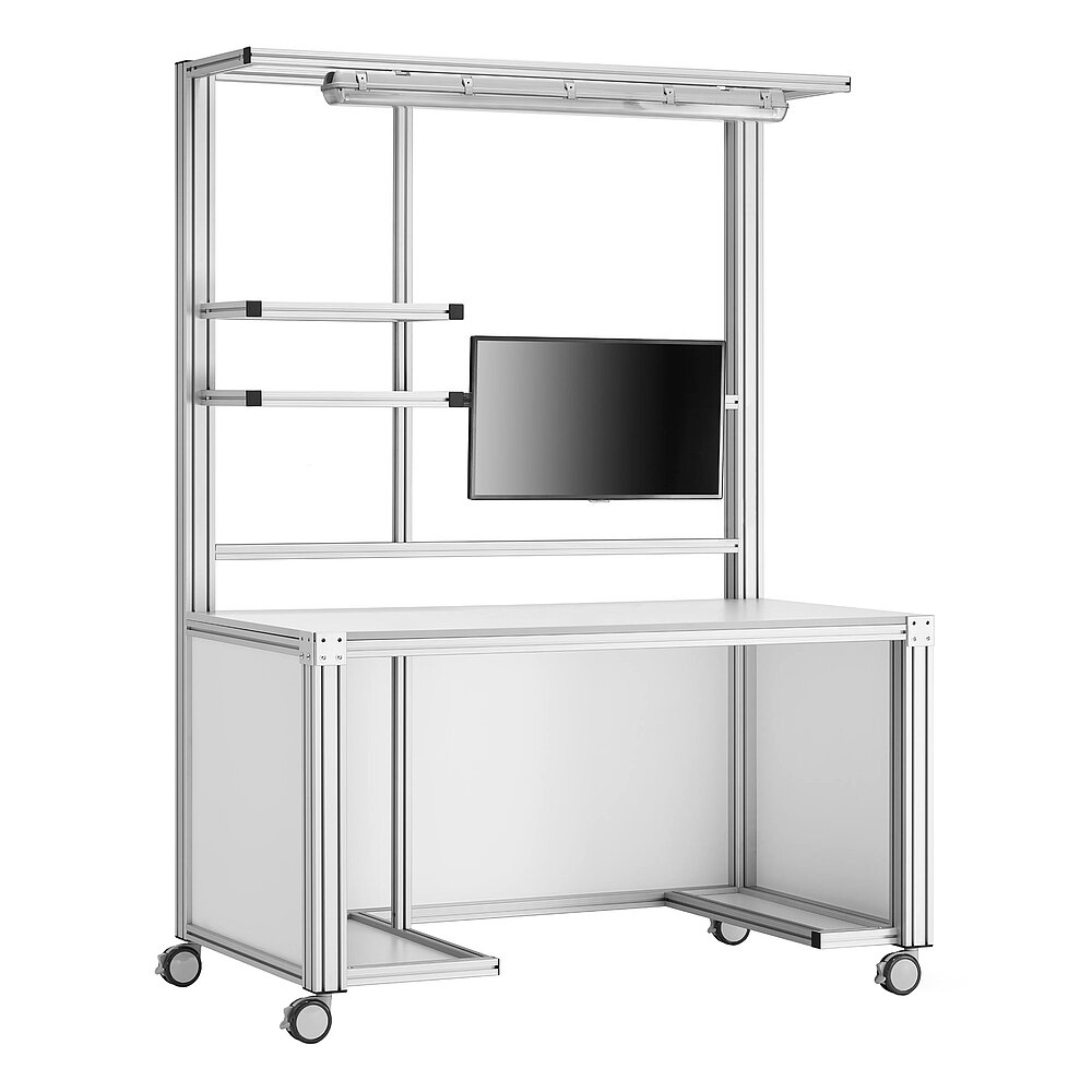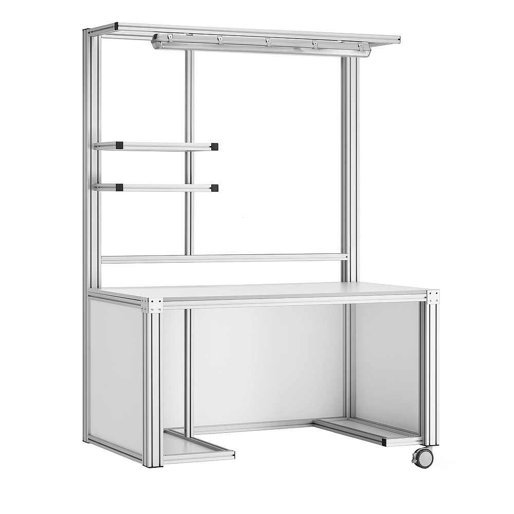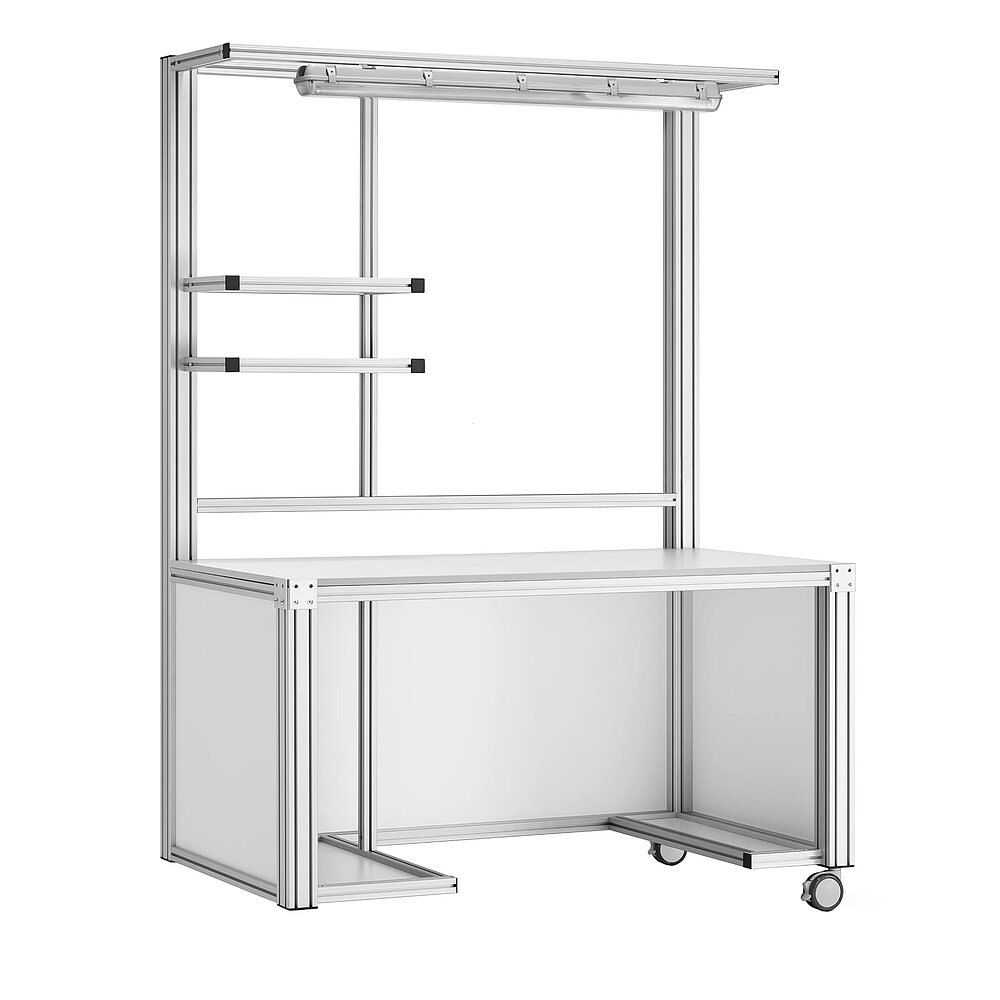 A large array of accessories allows for applying the aluminium profiles in a multitude of combinations, as shown here exemplary with this customer project of a mobile work table in the logistics area - even upgrades / extensions / re-design / replacements of existing projects are possible with little strain on time and money.