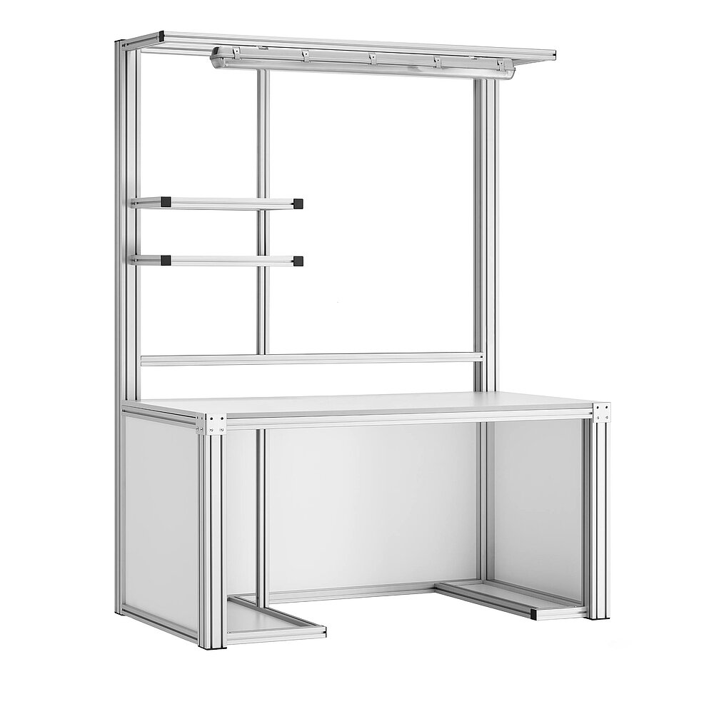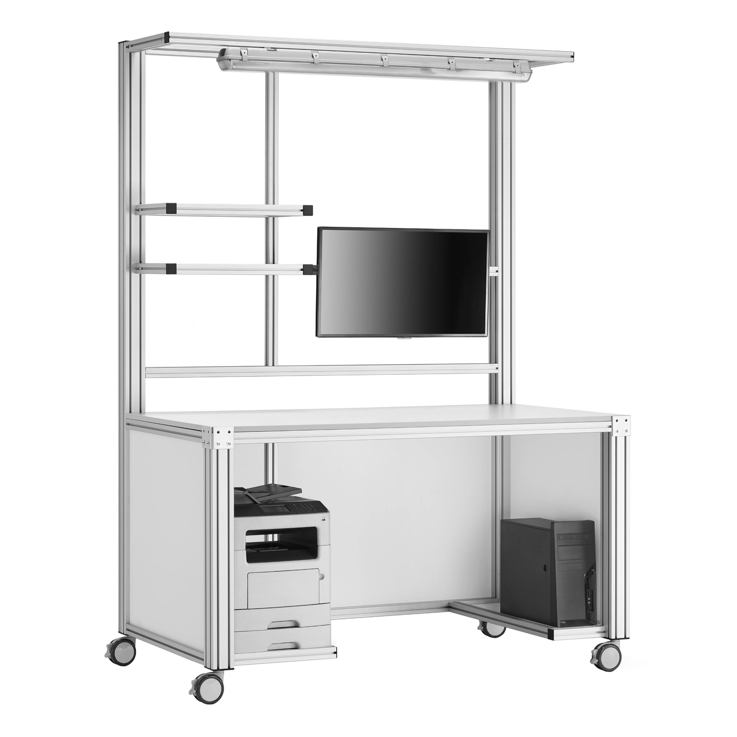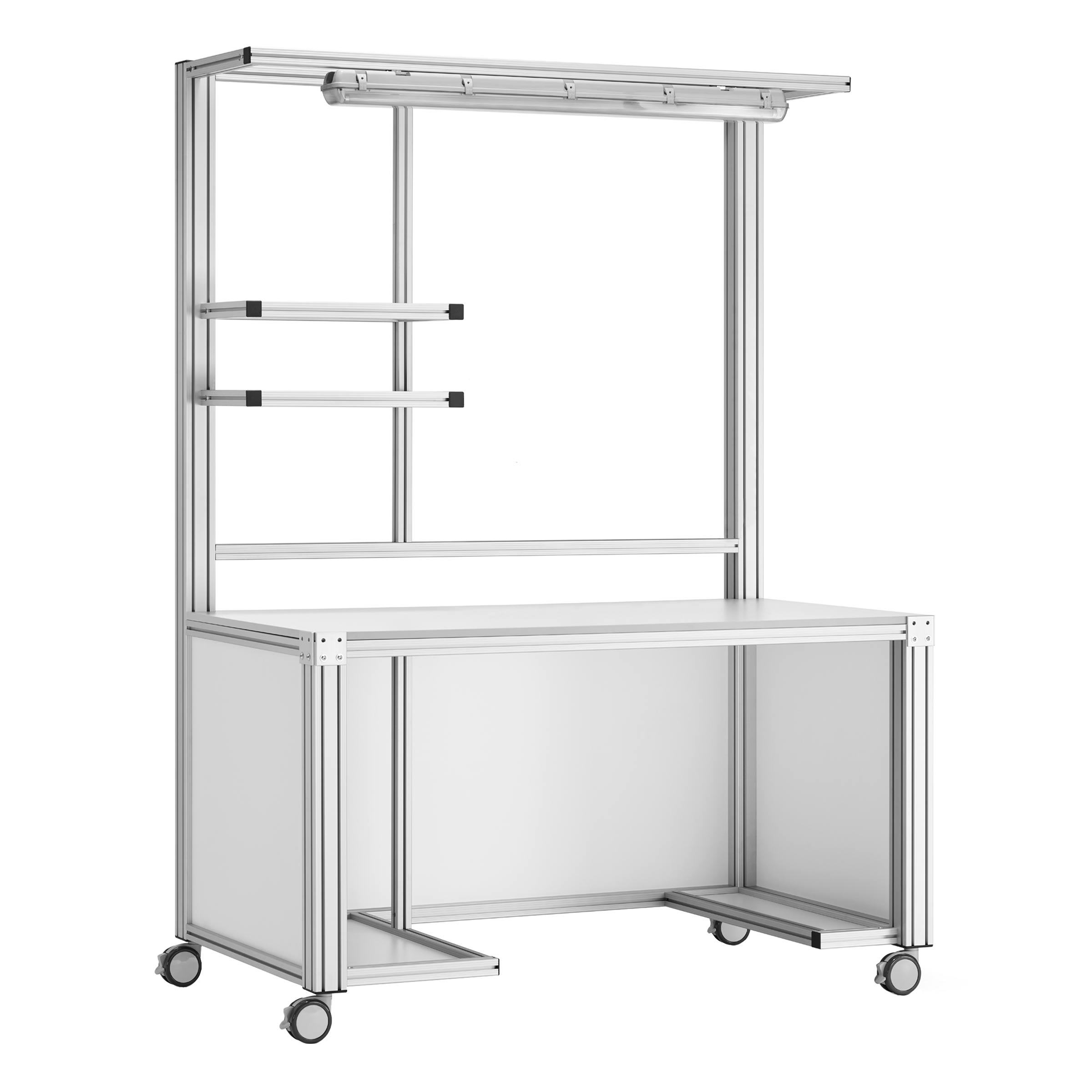 A large array of accessories allows for applying the aluminium profiles in a multitude of combinations, as shown here exemplary with this customer project of a mobile work table in the logistics area - even upgrades / extensions / re-design / replacements of existing projects are possible with little strain on time and money.