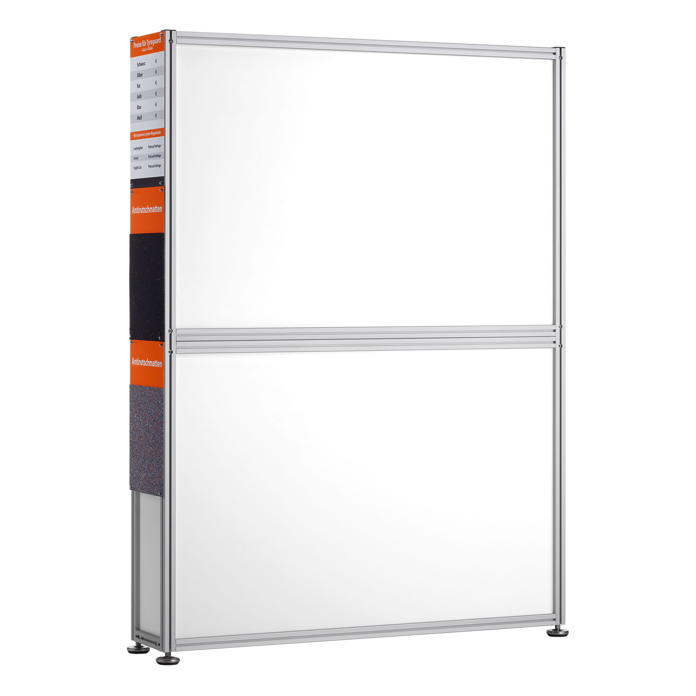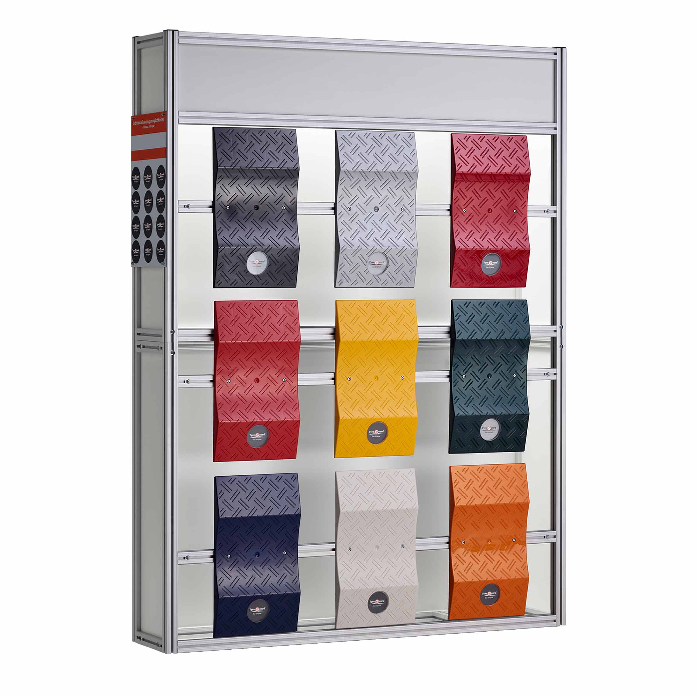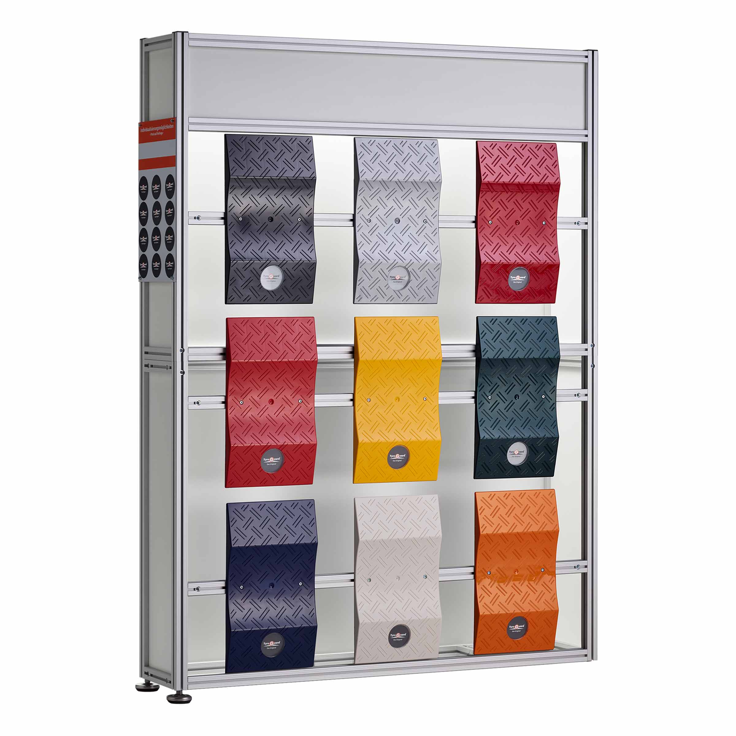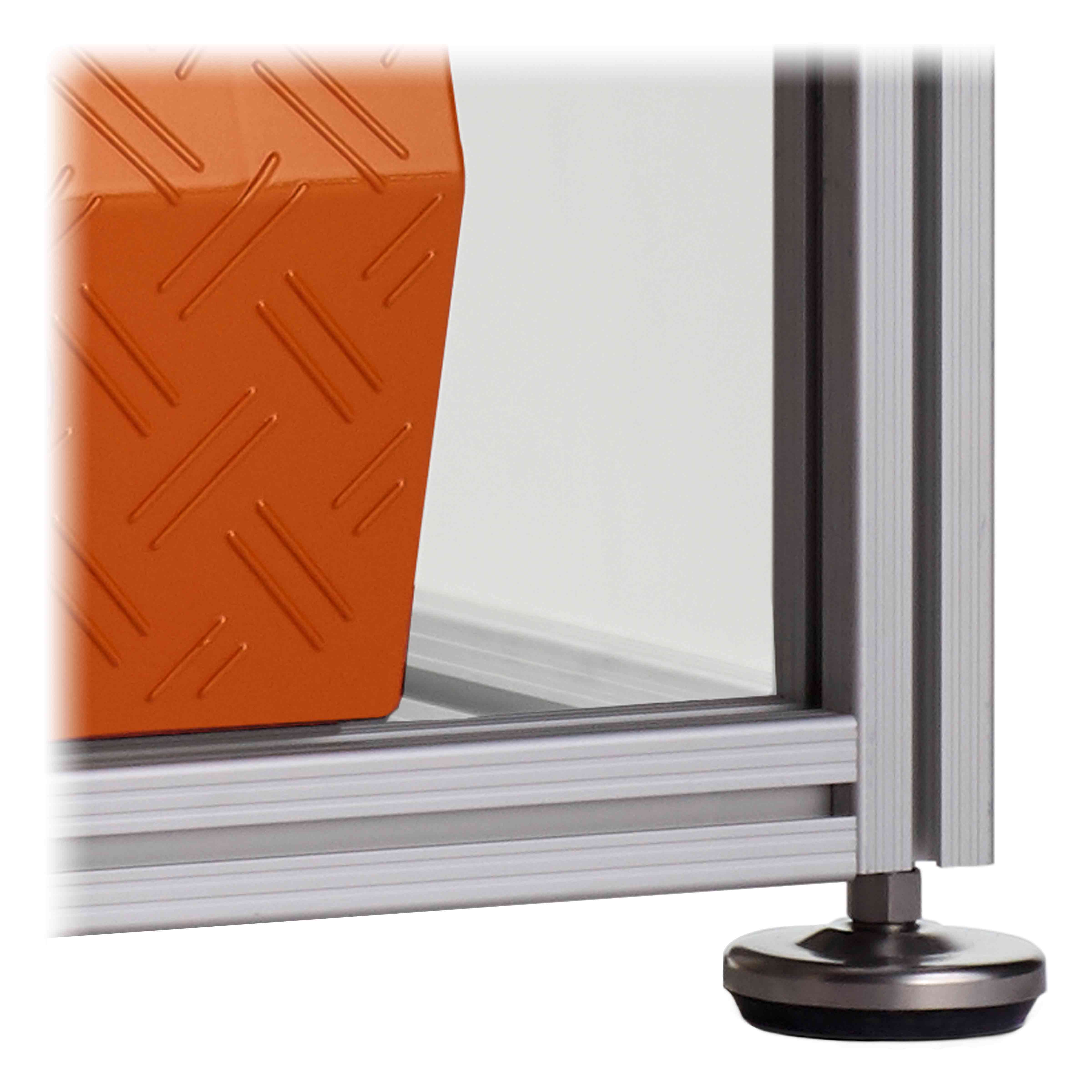 A large array of accessories allows for applying the aluminium profiles in a multitude of combinations, as shown here exemplary with this customer project of an easy-disassembly, easy-transport ( by regular car ) product display for exhibitions and road shows. For the perfect compensation of potential floor-unevenness, the product display is mounted on pendulum-action levelling elements LBE PH stainless steel.