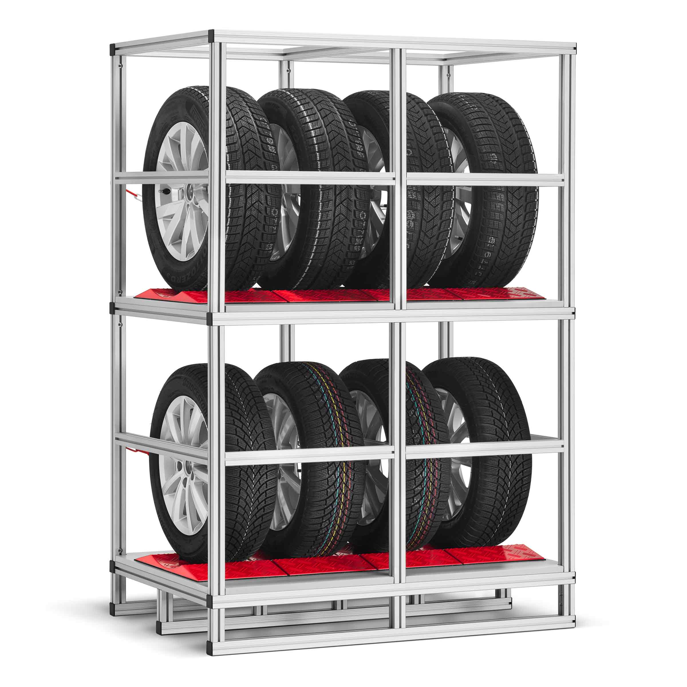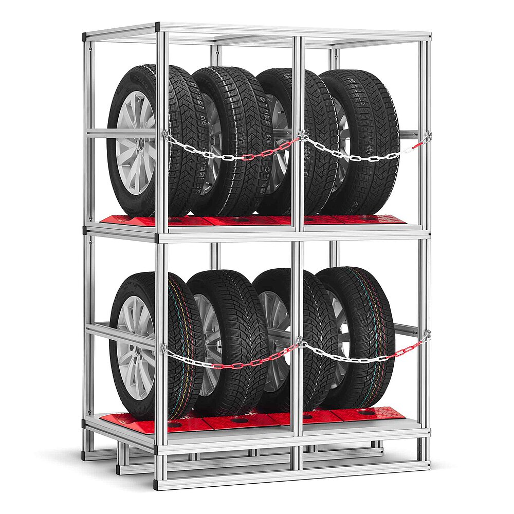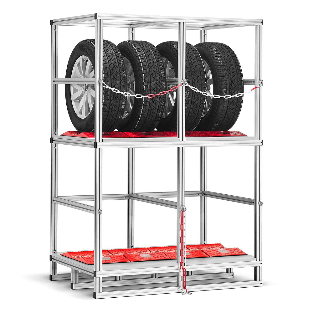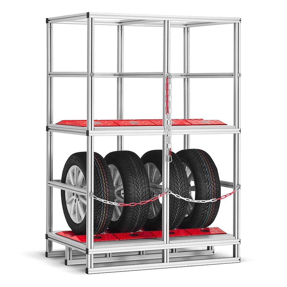 A large array of accessories allows for applying the aluminium profiles in a multitude of combinations, as shown here exemplary with this customer project of a tyre rack in EURO pallet size with two levels for tyre storage. Special highlight here are the original TyreGuard® tyre protectors.