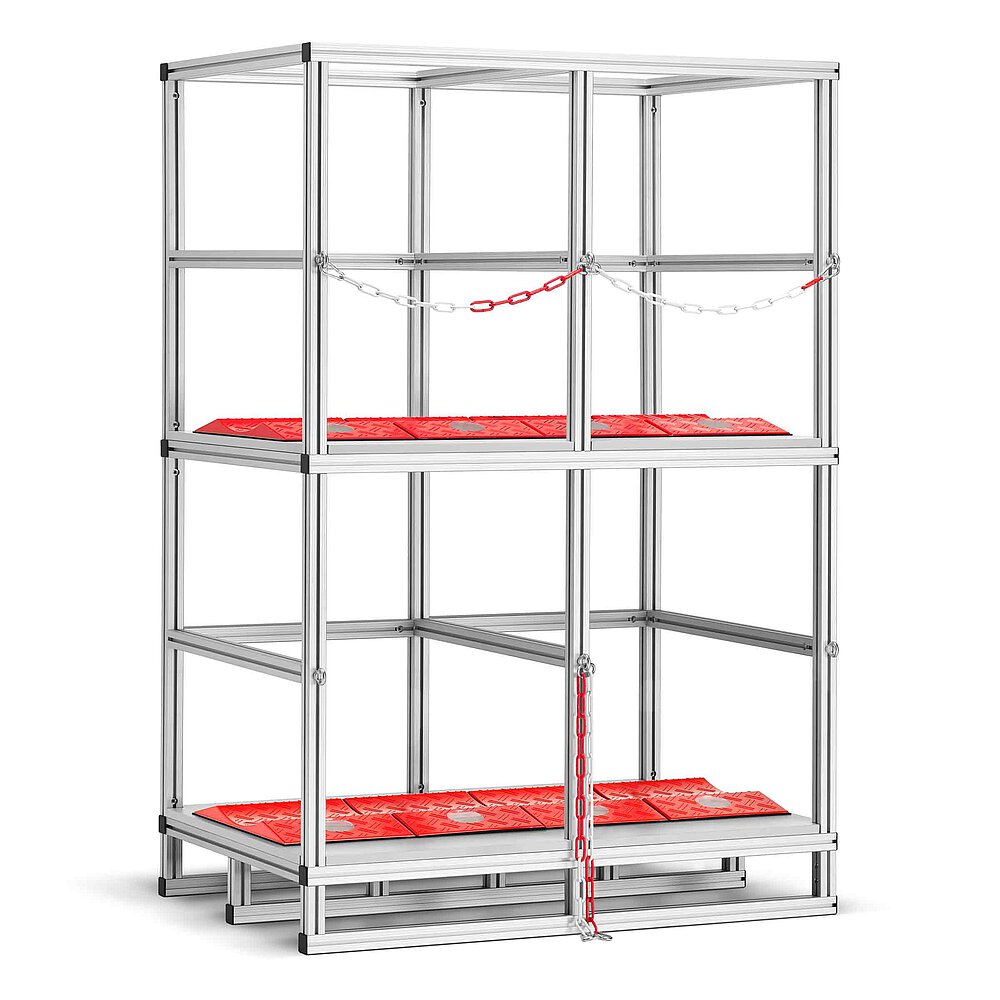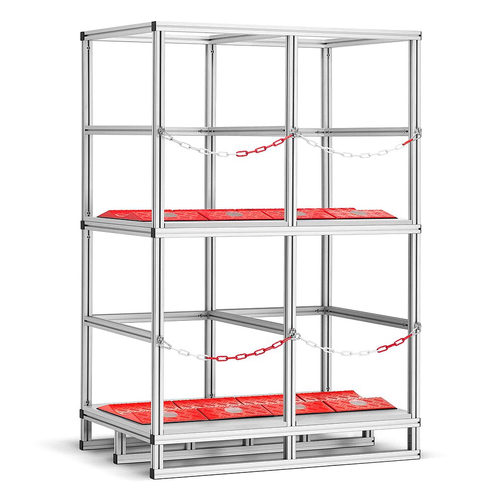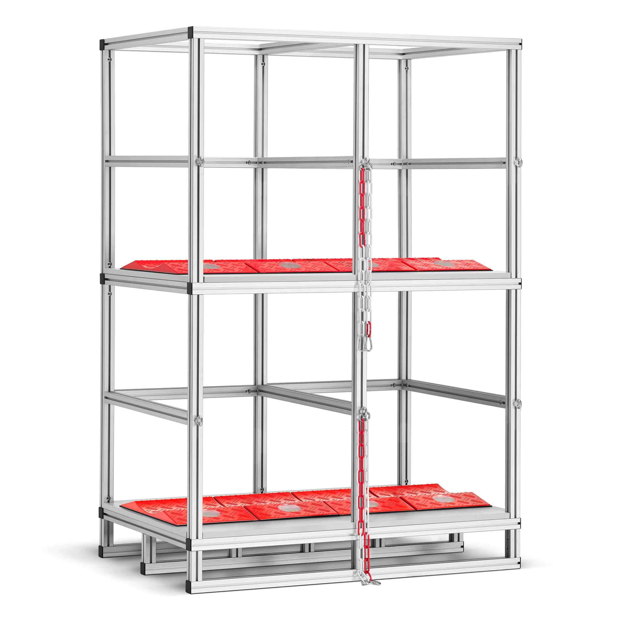 A large array of accessories allows for applying the aluminium profiles in a multitude of combinations, as shown here exemplary with this customer project of a tyre rack in EURO pallet size with two levels for tyre storage. Special highlight here are the original TyreGuard® tyre protectors.