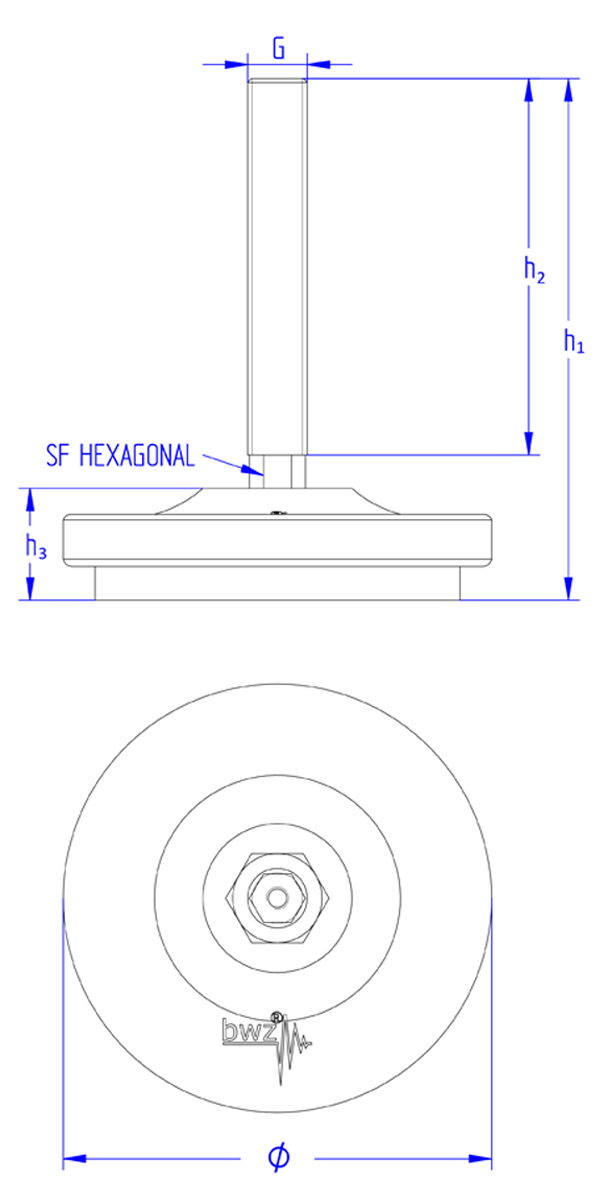 descriptionarticle number∅ (mm)h1 (mm)h2 (mm)h3 (mm)G(thread)SF HEXAGONAL(bottom, mm)shorehardness (±5 Shore)load (daN)