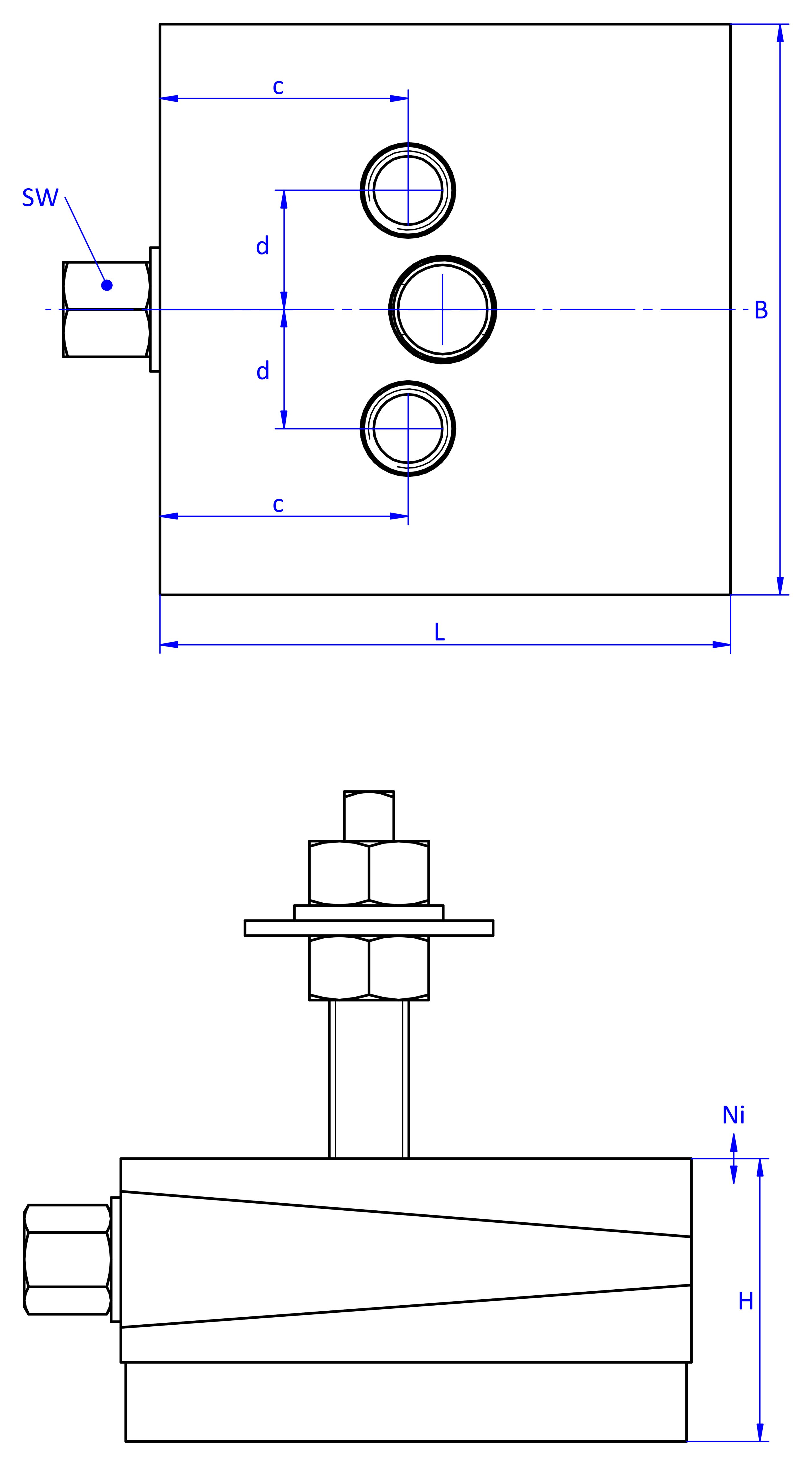 typearticle numberload (daN)L (mm)B (mm)H (mm)Ni (mm)SW (a/i)c (mm)d (mm)thread (bolt-on bottom)mass (kg)