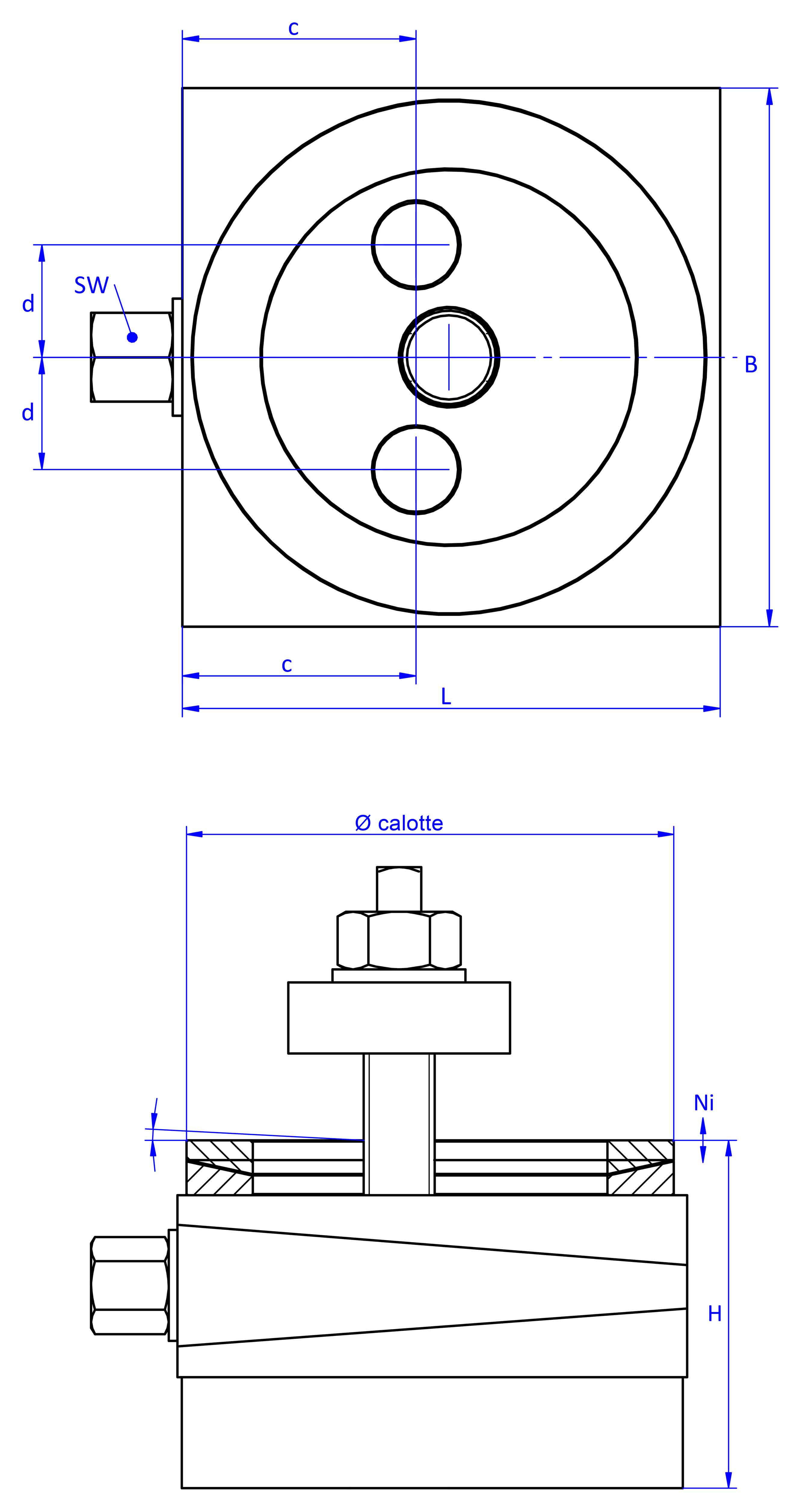 typearticle numberload (daN)L (mm)B (mm)H (mm)Ni (mm)SW (a/i)c (mm)d (mm)drill hole (mm)calotte (Ø mm)mass (kg)