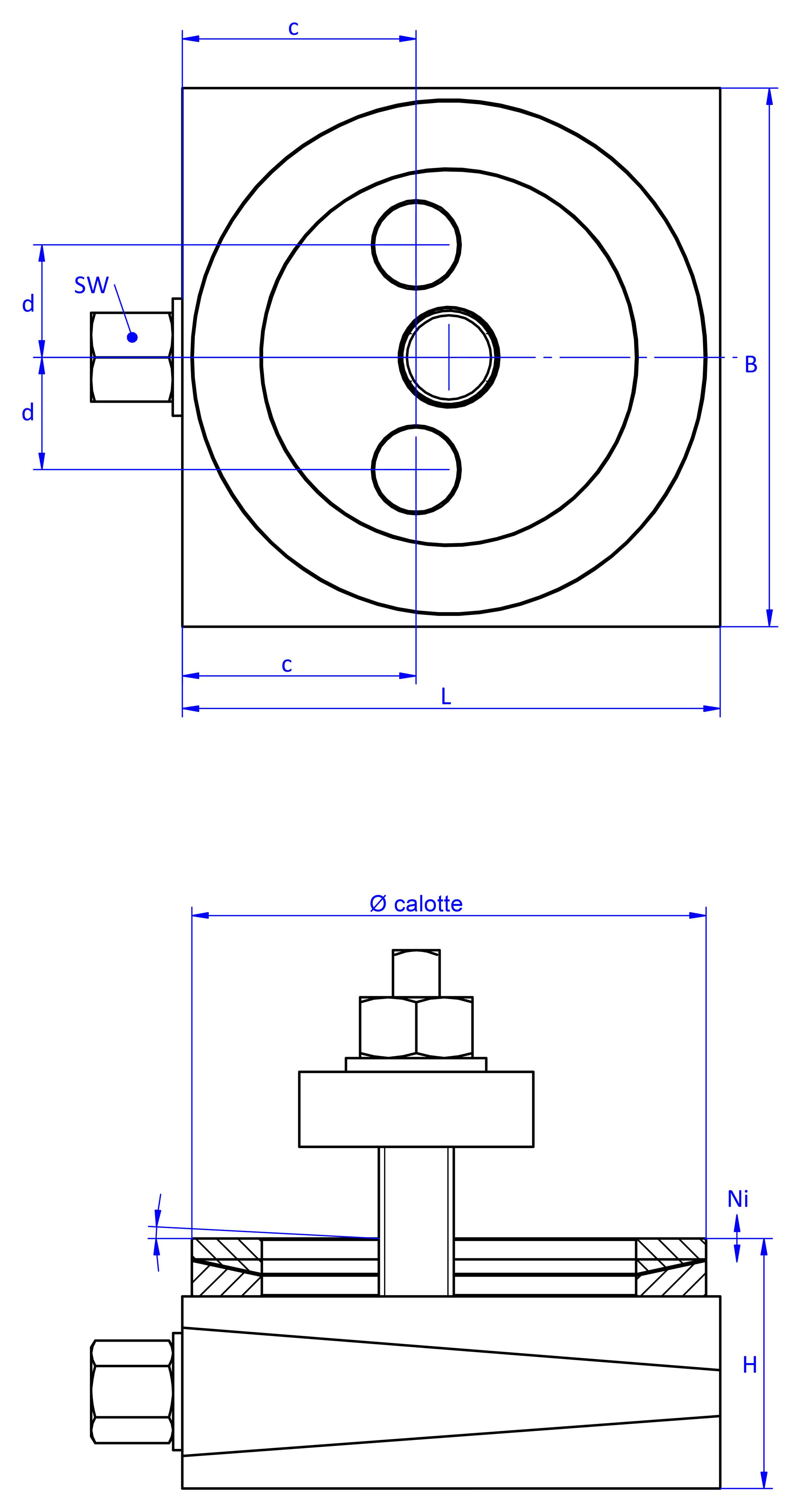 type without elastomer boardarticle numberload (daN)L (mm)B (mm)H (mm)Ni (mm)SW (a/i)c (mm)d (mm)drill hole (mm)calotte (Ø mm)mass (kg)