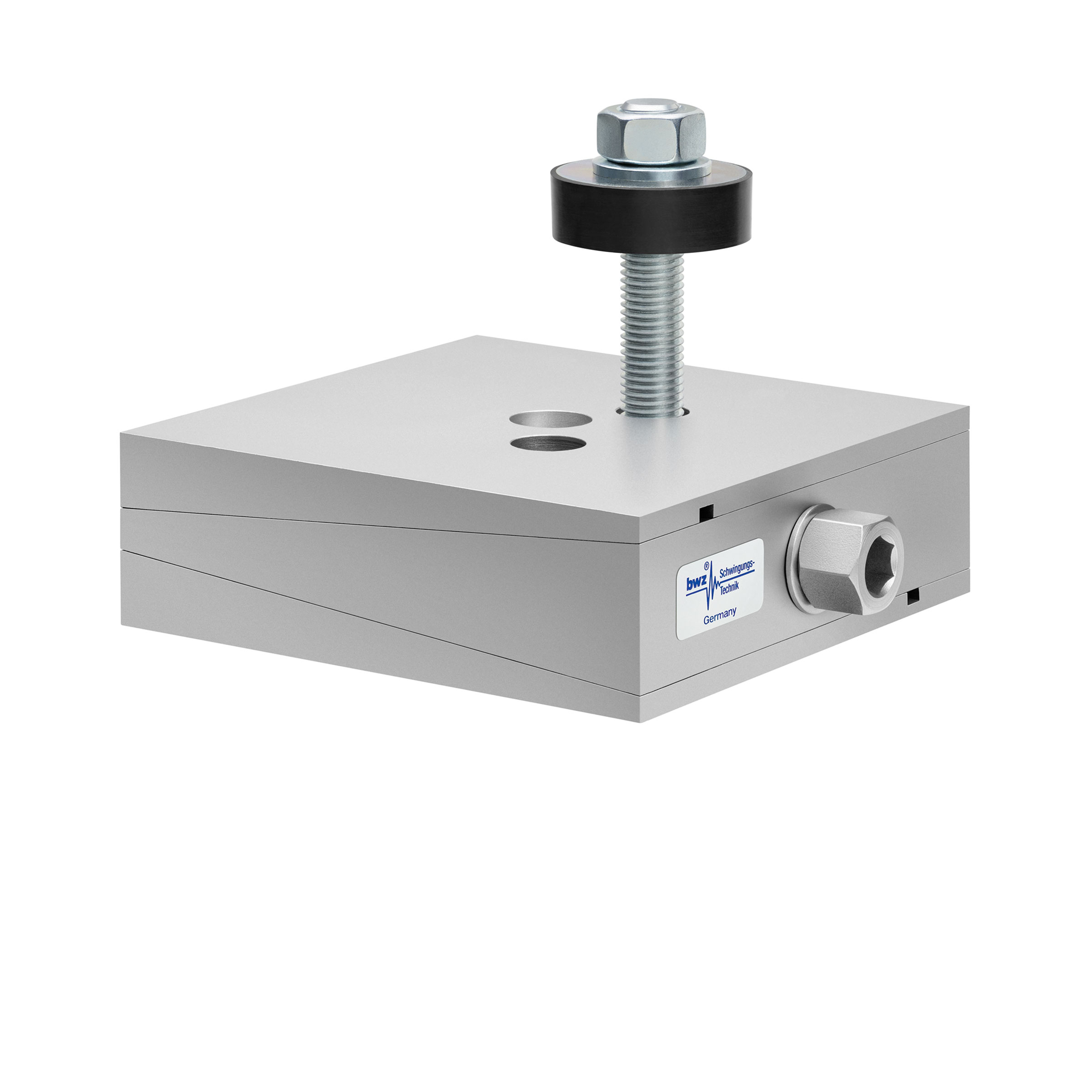 a square, height-adjustable machine mount made of precision-milled metal, adjusted in middle position, consisting of top, middle and bottom part lacquered in silver colour, with the wedge-shaped middle part featuring a protruding centered hexagonal screw for height adjustment, two holes for fastening screws in the top part, a fastening screw fastened in the bottom part and a medium-thick black elastomer with smooth surface for vibration damping at the bottom, isolated on white background