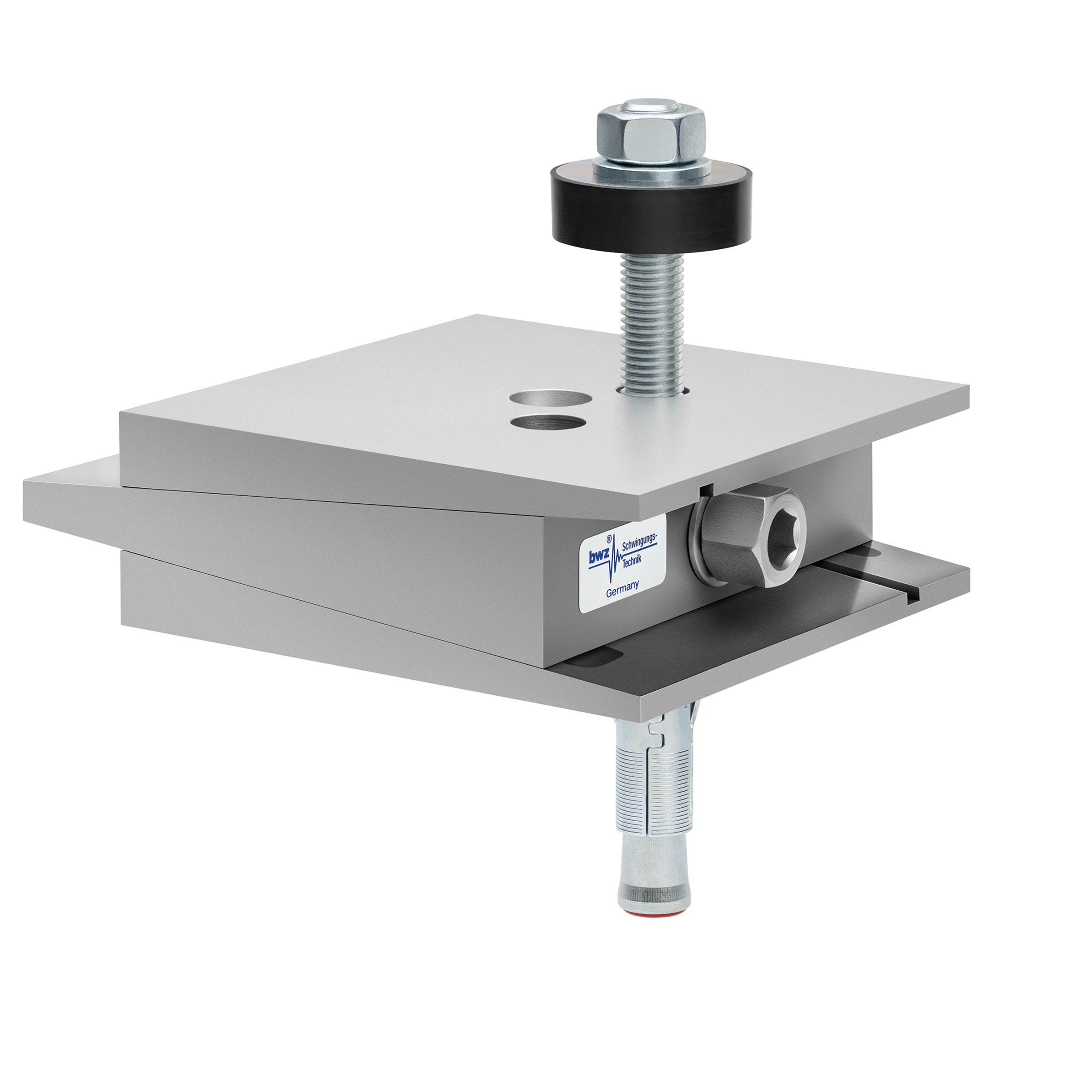 a square, height-adjustable machine mount made of precision-milled metal, adjusted in middle position, consisting of top, middle and bottom part lacquered in silver colour, with the wedge-shaped middle part featuring a protruding centered hexagonal screw for height adjustment, two holes for fastening screws in the top part, a fastening screw passing through the bottom part and sticking out on top with a screwhead isolation disc at the top screw end, a medium-thick black elastomer with structured surface for vibration isolation at the bottom and below, a zinc-galvanized ground dovel, isolated on white background