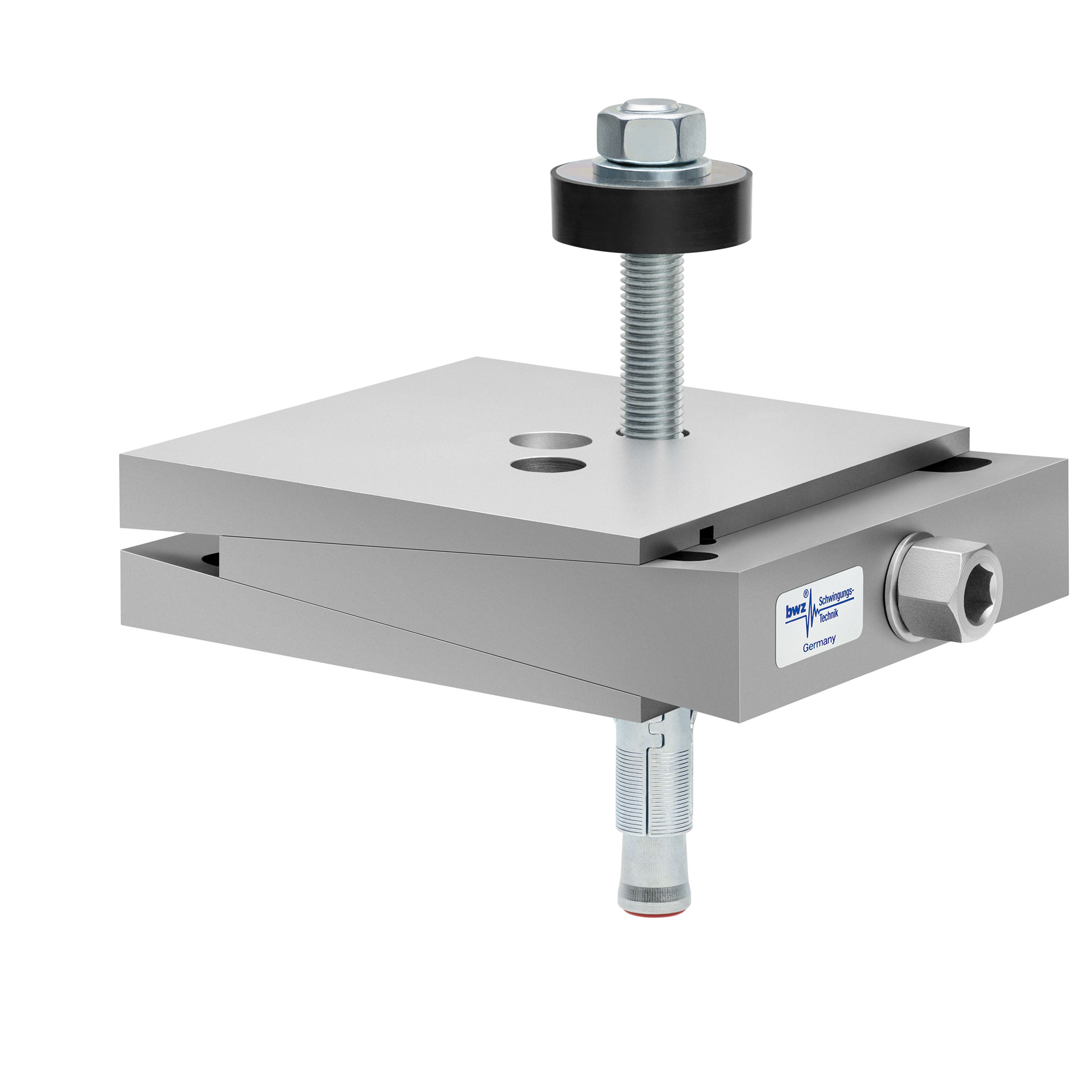 a square, height-adjustable machine mount made of precision-milled metal, adjusted in middle position, consisting of top, middle and bottom part lacquered in silver colour, with the wedge-shaped middle part featuring a protruding centered hexagonal screw for height adjustment, an angular compensation calotte consisting of two spherical, aligned metal rings fastened onto the top part, a fastening screw fastened in the bottom part and a thin black elastomer with smooth surface for non-slip protection at the bottom, isolated on white background