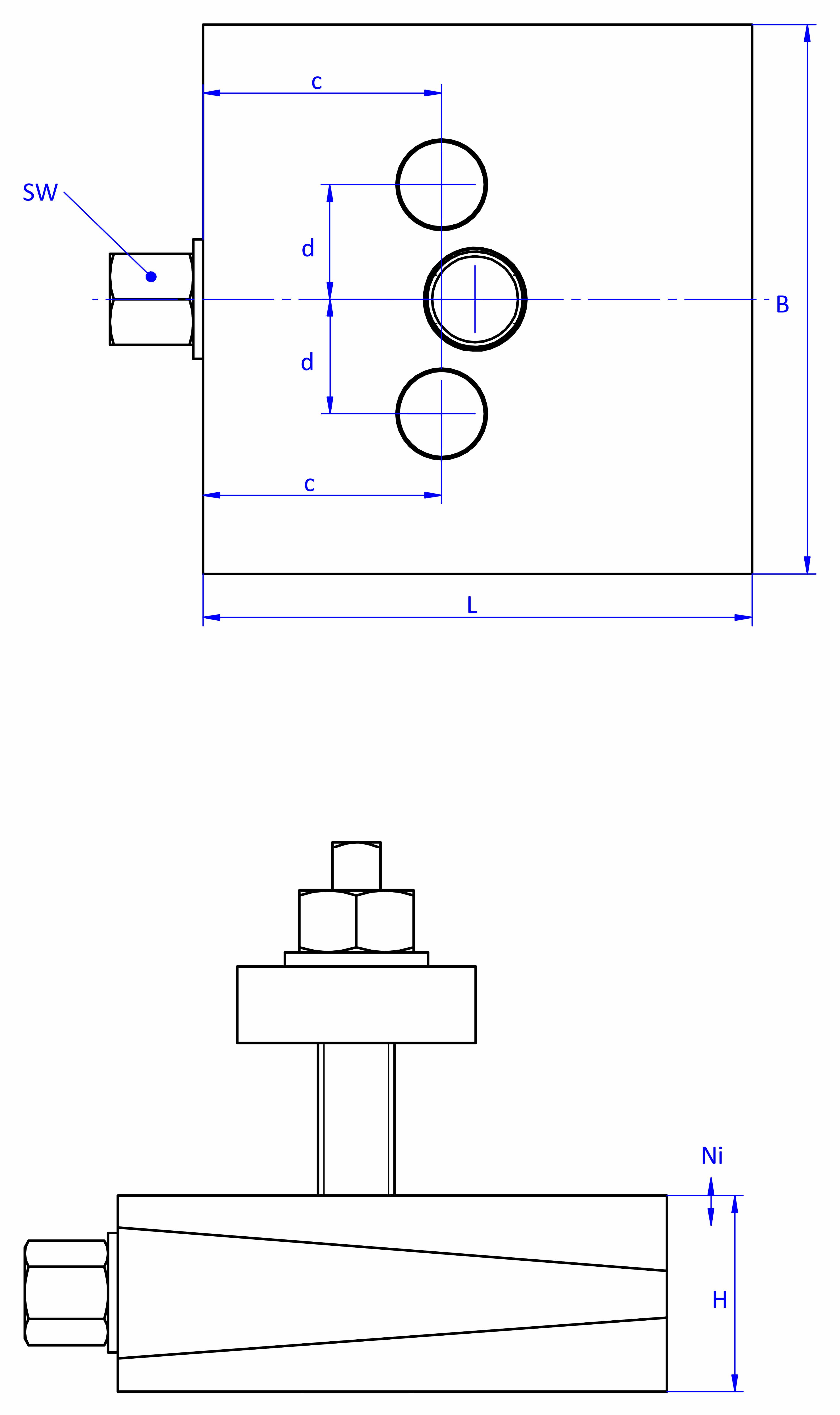 type without elastomer boardarticle numberload (daN)L (mm)B (mm)H (mm)Ni (mm)SW (a/i)c (mm)d (mm)drill hole (Ø mm)mass (kg)