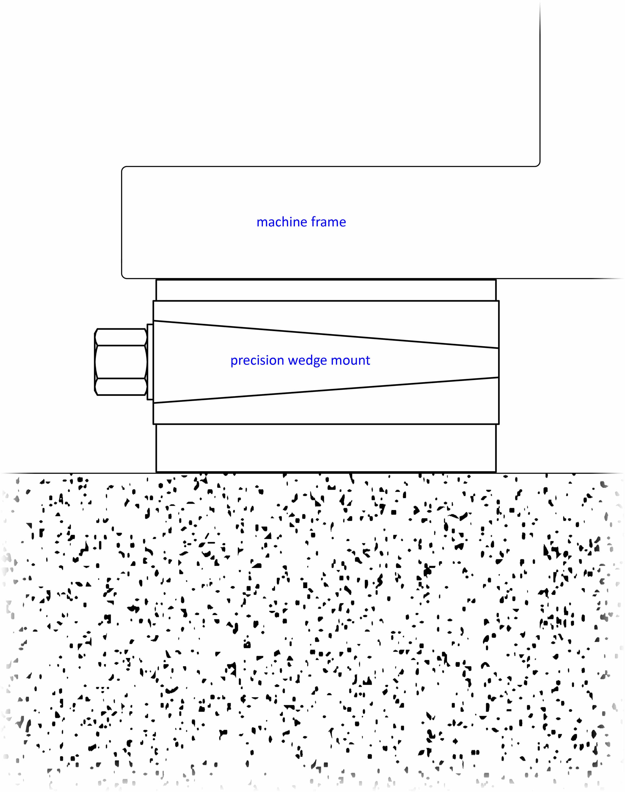 an illustration depicting the cross-section of a machine frame and a height-adjustable machine mount placed underneath featuring vibration-isolating elastomer at its top and bottom, and the foundation at the very bottom