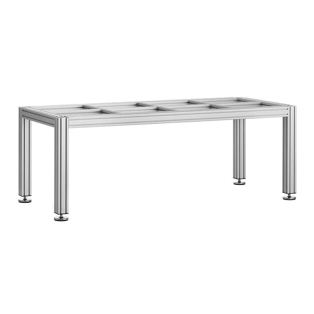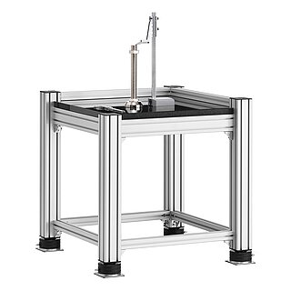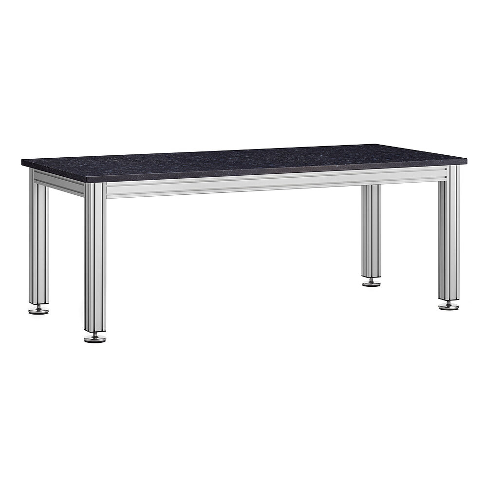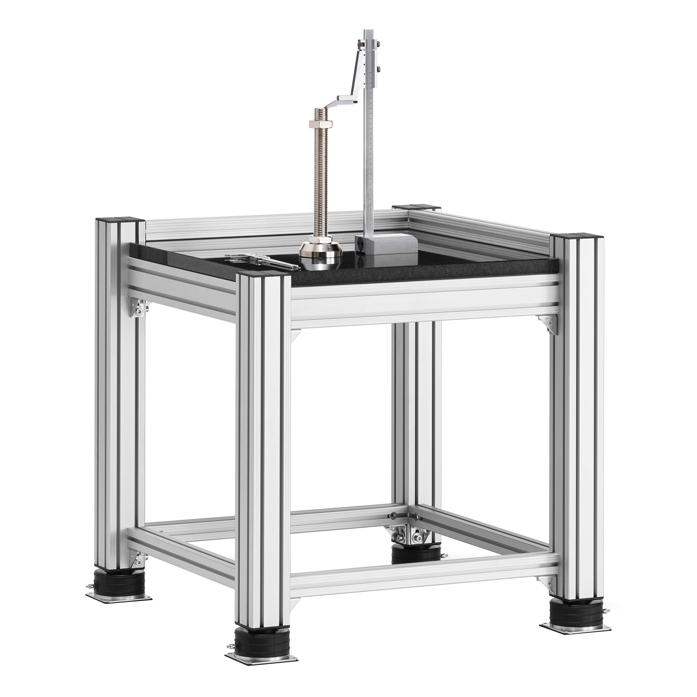 Mit einem umfangreichen Zubehörprogramm lassen sich Konstruktionsprofile aus Aluminium in vielen Kombinationen verwenden, wie hier exemplarisch in diesem Kundenprojekt eines exklusiven Besprechungstisches mit Natursteinplatte. Der Ausgleich von eventuellen Bodenunebenheiten erfolgt hier durch unsere pendelnden Nivellierelemente LBE PH Edelstahl aus dem Produktbereich der Schwingungstechnik.