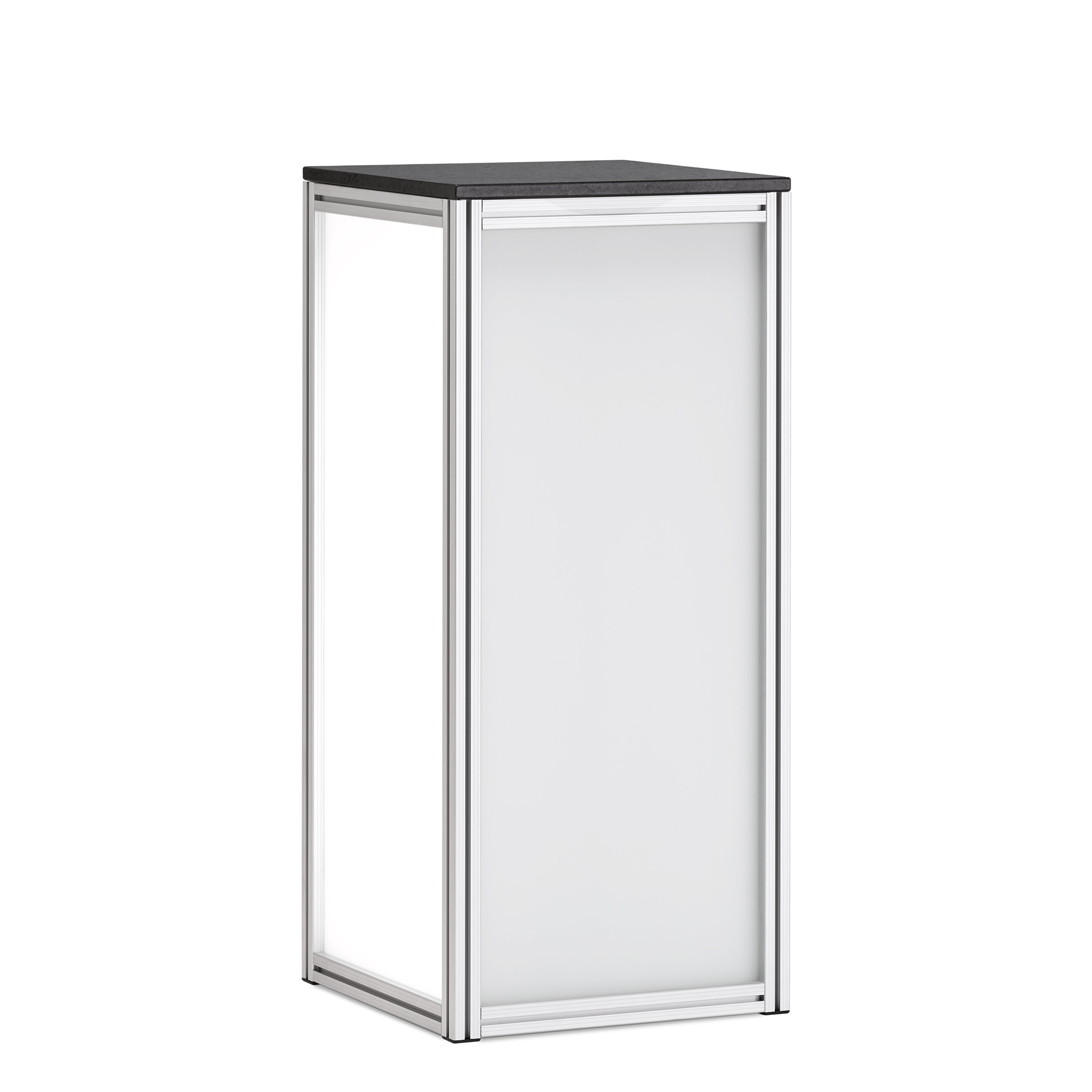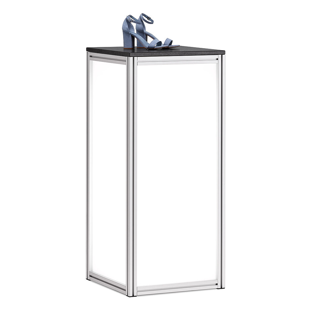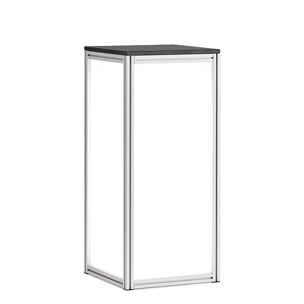 Mit einem umfangreichen Zubehörprogramm lassen sich Konstruktionsprofile aus Aluminium in vielen Kombinationen verwenden, wie hier exemplarisch in diesem Kundenprojekt eines von innen beleuchteten Messedisplays mit edler Natursteinplatte für den geschmackvollen Produktauftritt.