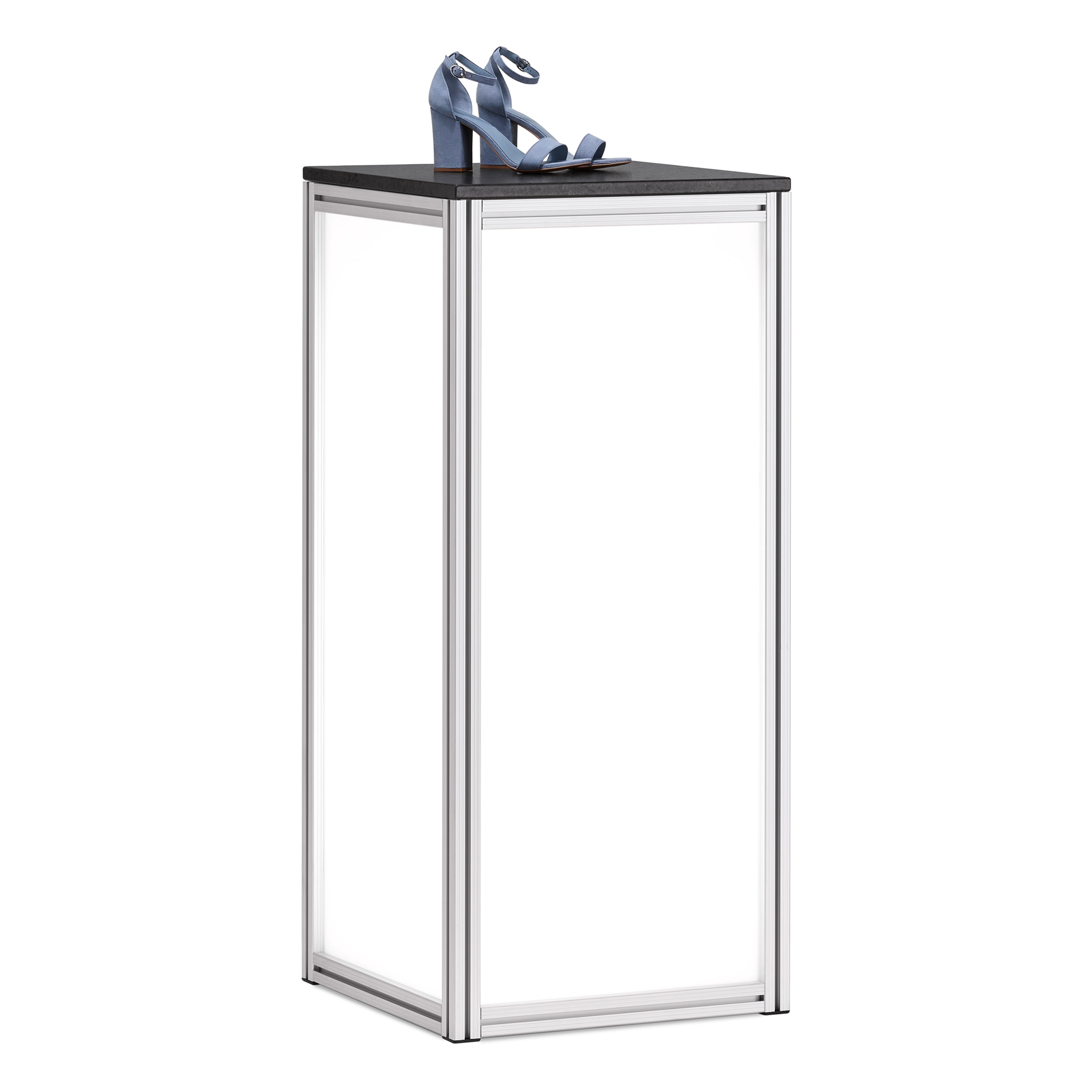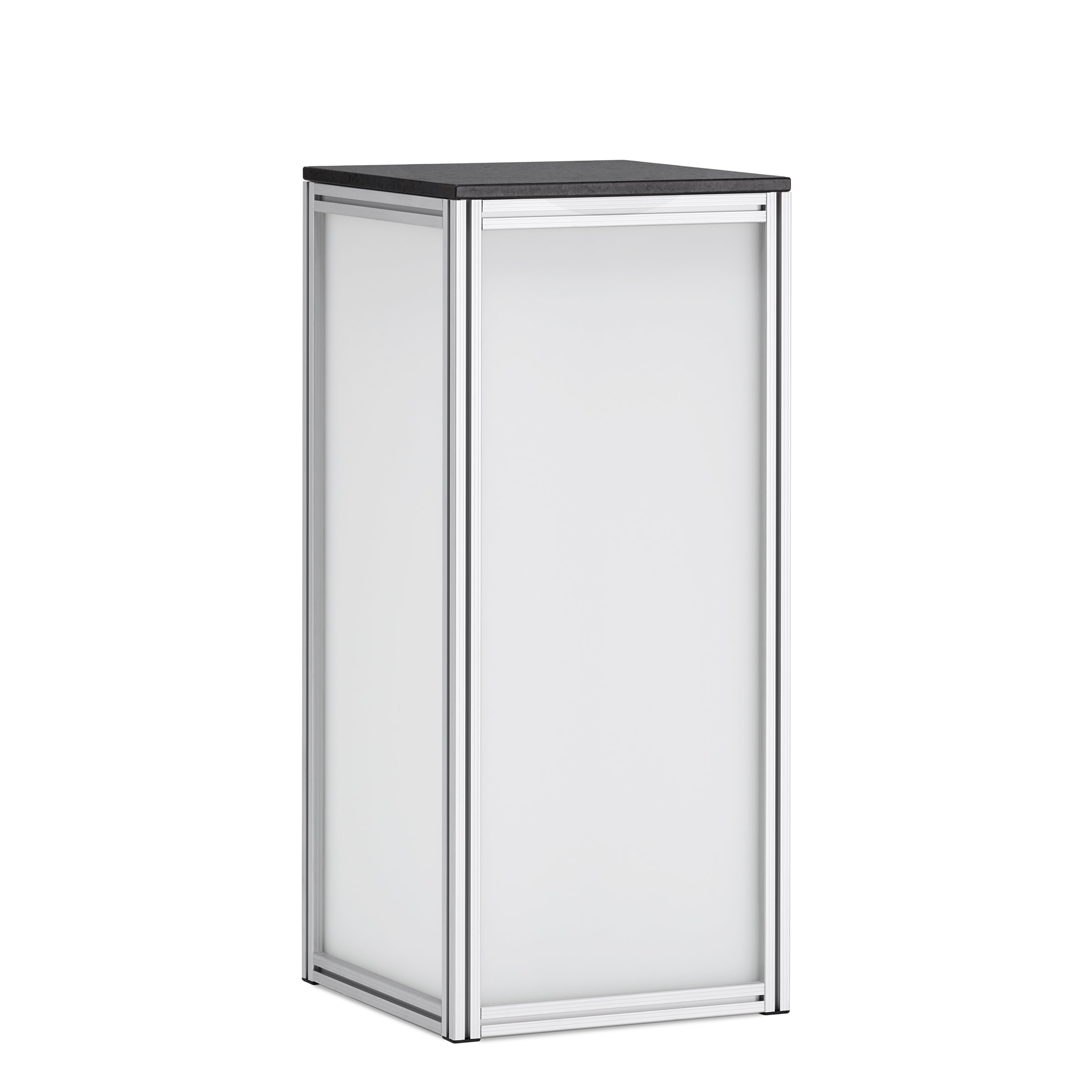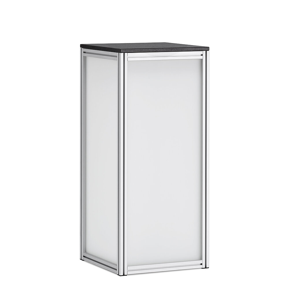 Mit einem umfangreichen Zubehörprogramm lassen sich Konstruktionsprofile aus Aluminium in vielen Kombinationen verwenden, wie hier exemplarisch in diesem Kundenprojekt eines von innen beleuchteten Messedisplays mit edler Natursteinplatte für den geschmackvollen Produktauftritt.