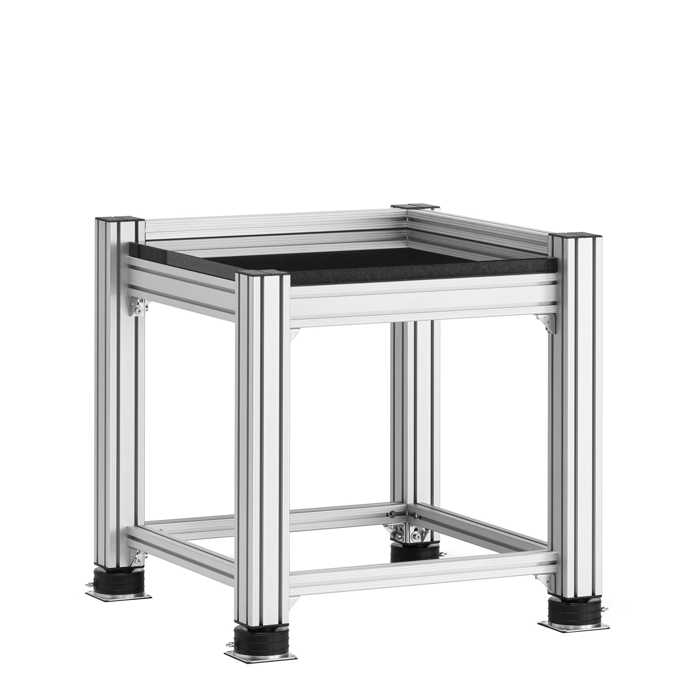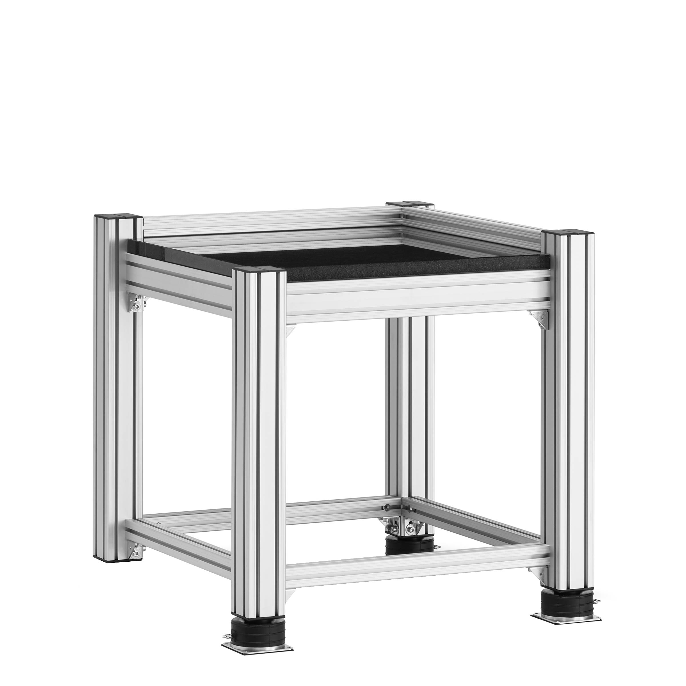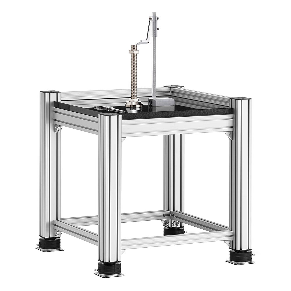 Mit einem umfangreichen Zubehörprogramm lassen sich Konstruktionsprofile aus Aluminium in vielen Kombinationen verwenden, wie hier exemplarisch in diesem Kundenprojekt eines Messtisches mit massiver Granitplatte und hocheffektiver Schwingungsentkopplung, realisiert durch Aufstellung auf Luftfeder-Elemente FLN.