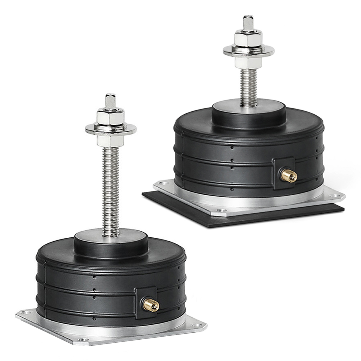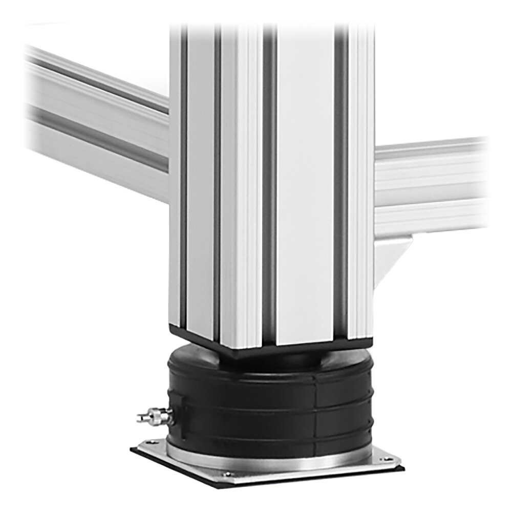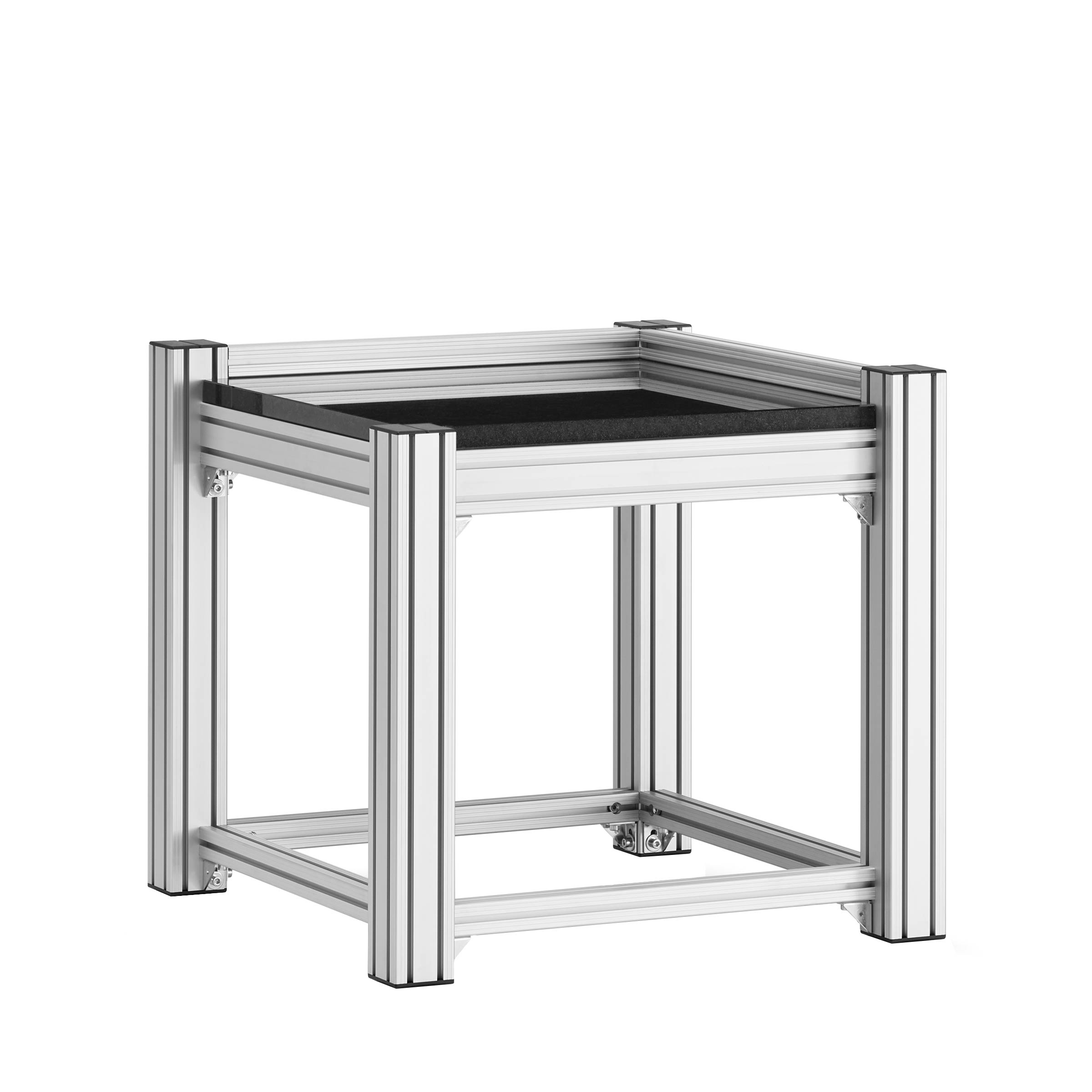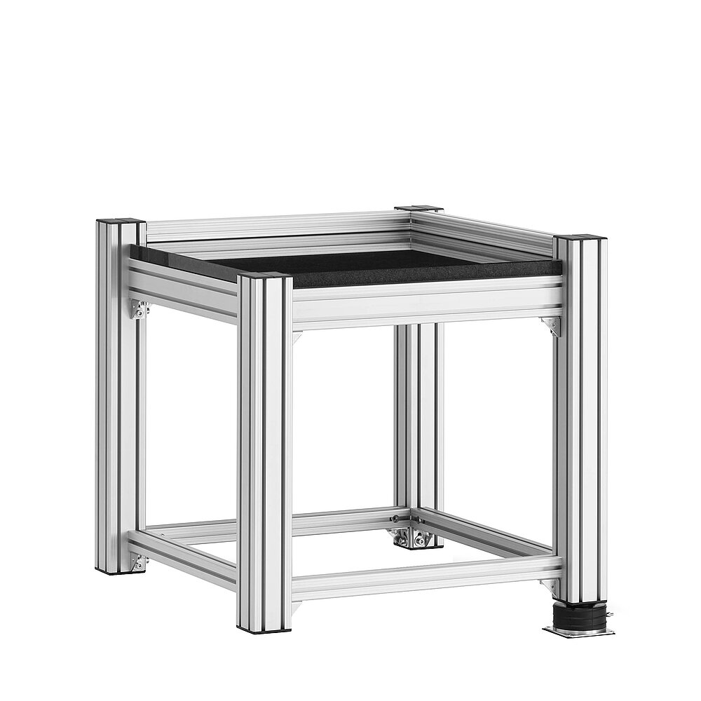 Mit einem umfangreichen Zubehörprogramm lassen sich Konstruktionsprofile aus Aluminium in vielen Kombinationen verwenden, wie hier exemplarisch in diesem Kundenprojekt eines Messtisches mit massiver Granitplatte und hocheffektiver Schwingungsentkopplung, realisiert durch Aufstellung auf Luftfeder-Elemente FLN.