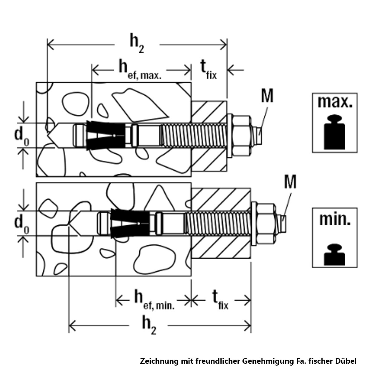 | Bezeichnung | Artikelnummer | passend für | *Min. Bohrlochtiefe h2(mm) | Dübellängel(mm) | Nutzlänge max.hef,max./hef,min.tfix | Montage-Drehmoment(Nm) |