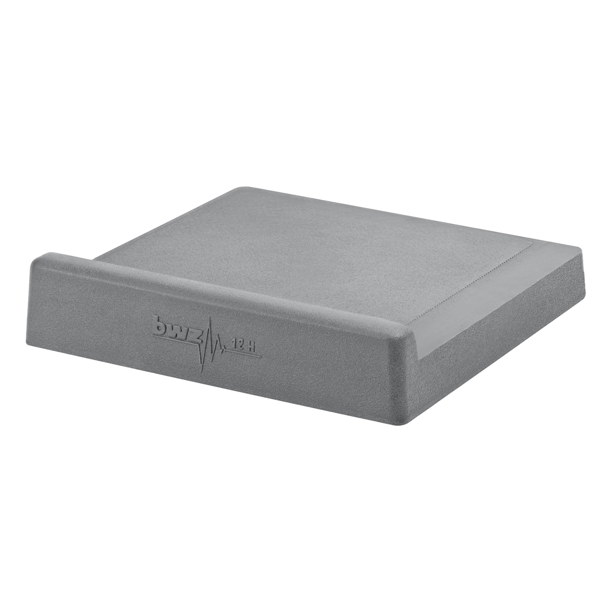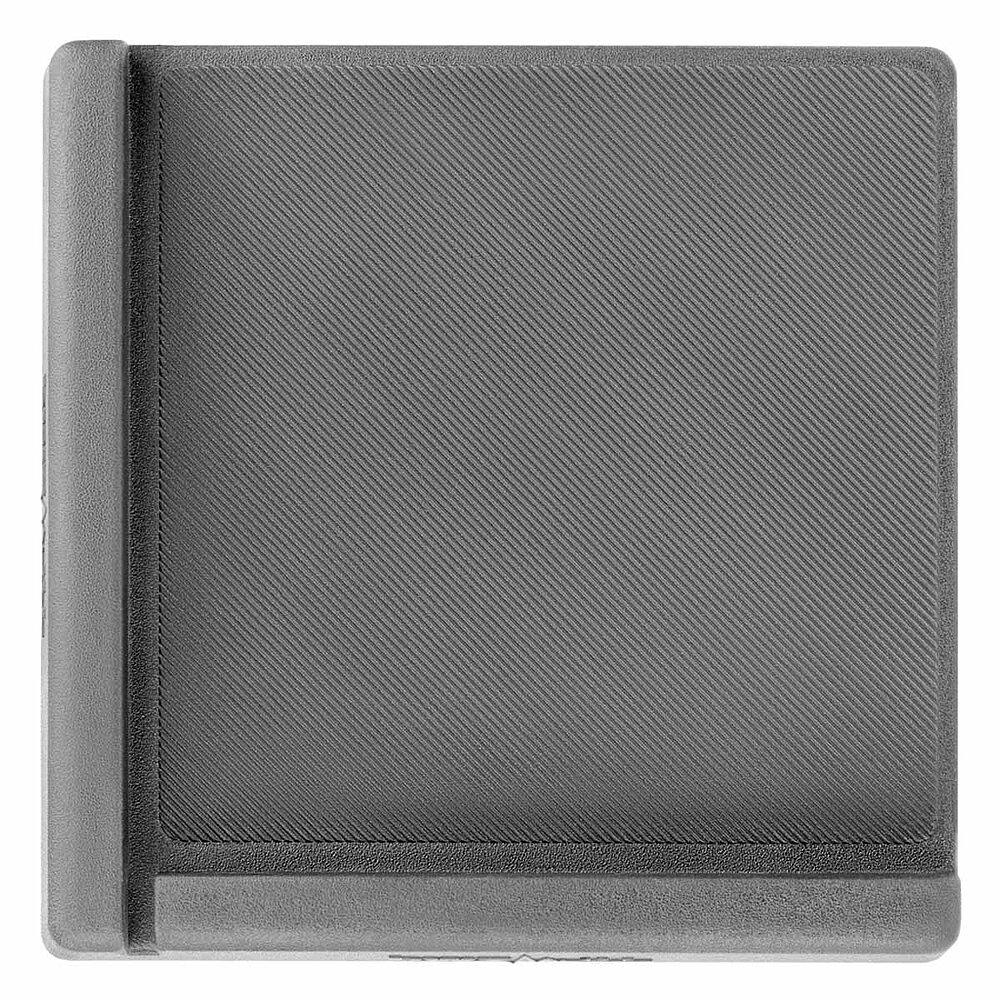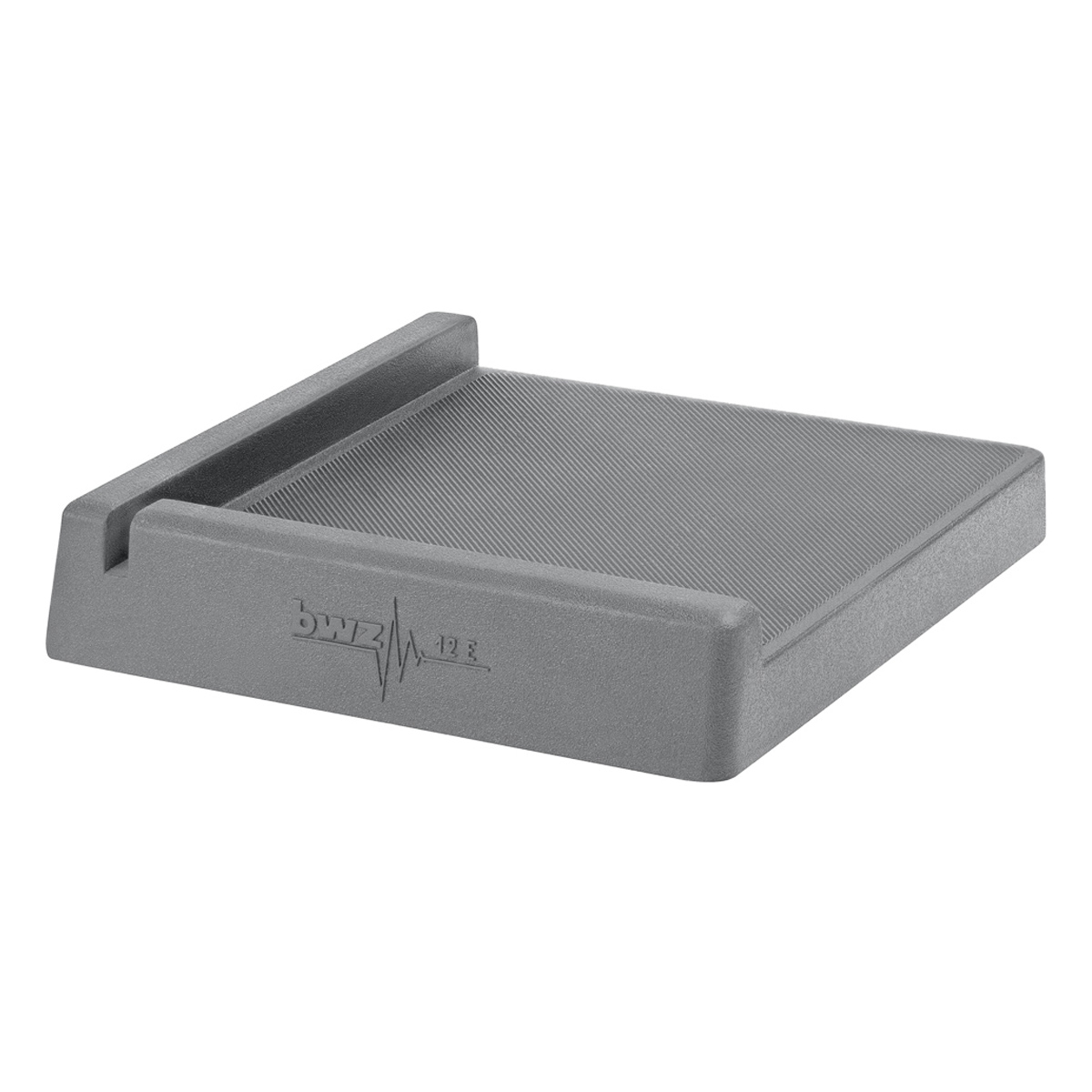 ein großes hellgraues quadratisches Elastomer-Formstück in der Ansicht von der Seite und von oben mit zwei seitlichen Stegen und feinen parallelen Rillen auf der Oberfläche auf weißem Hintergrund