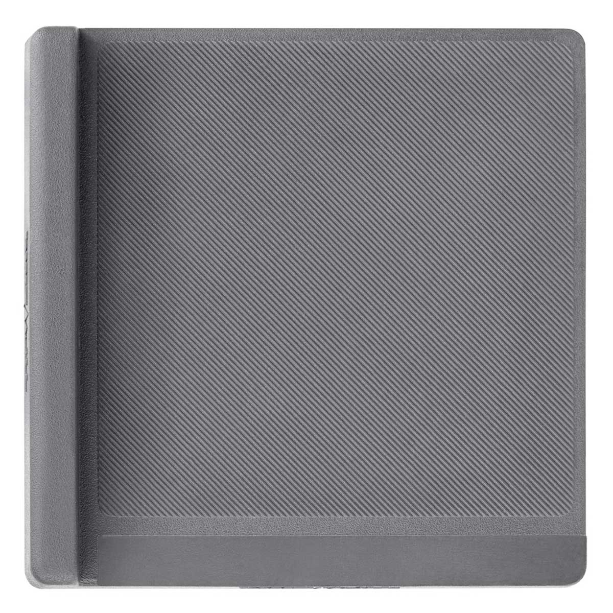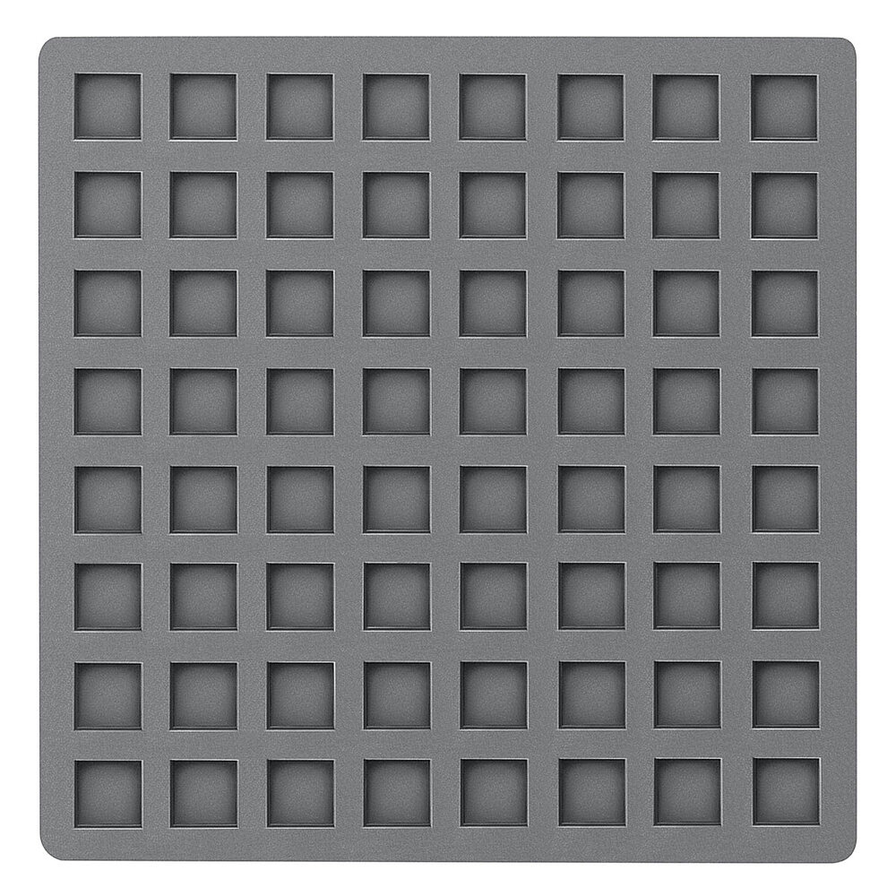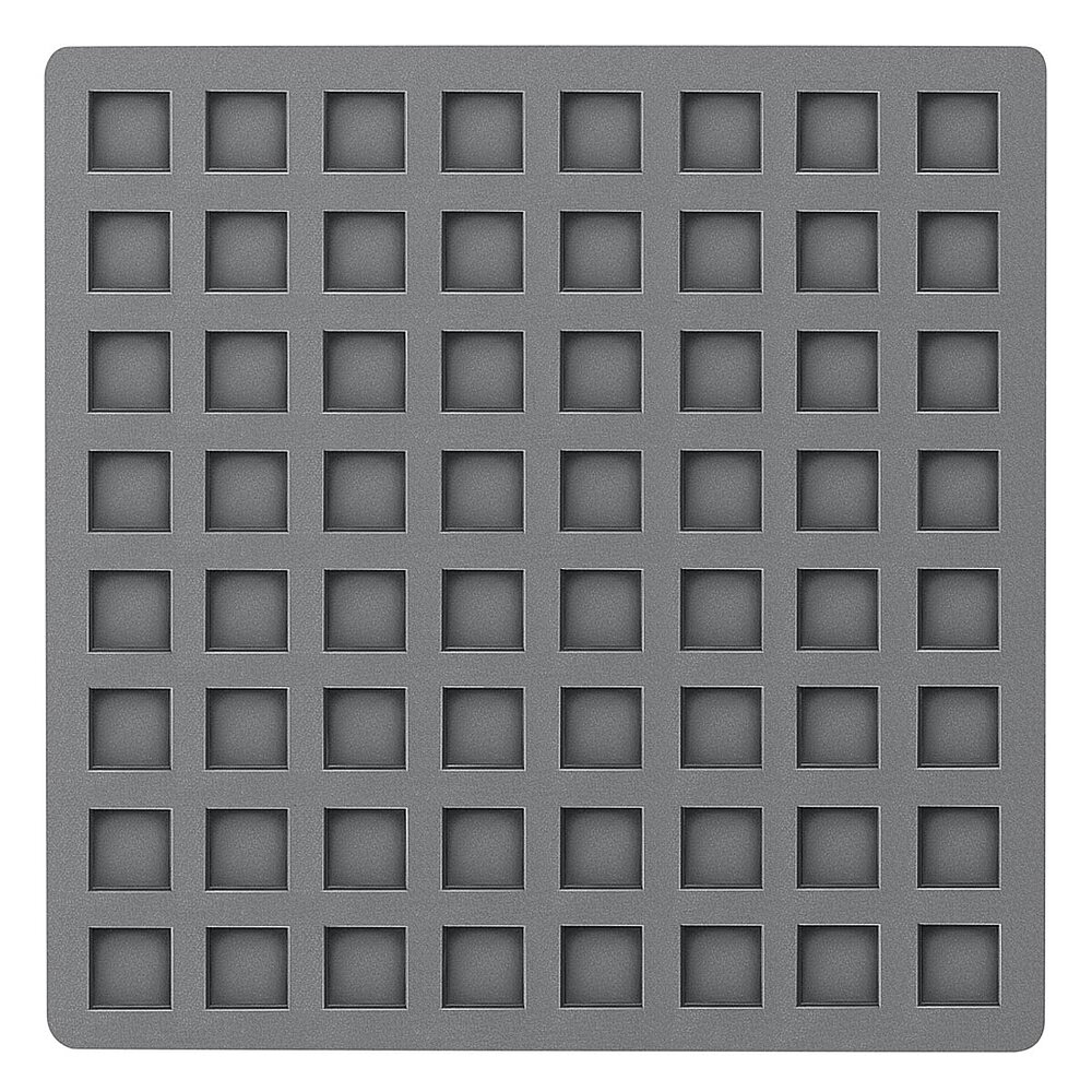ein großes hellgraues quadratisches Elastomer-Formstück in der Ansicht von der Seite und von oben mit zwei seitlichen Stegen und feinen parallelen Rillen auf der Oberfläche auf weißem Hintergrund