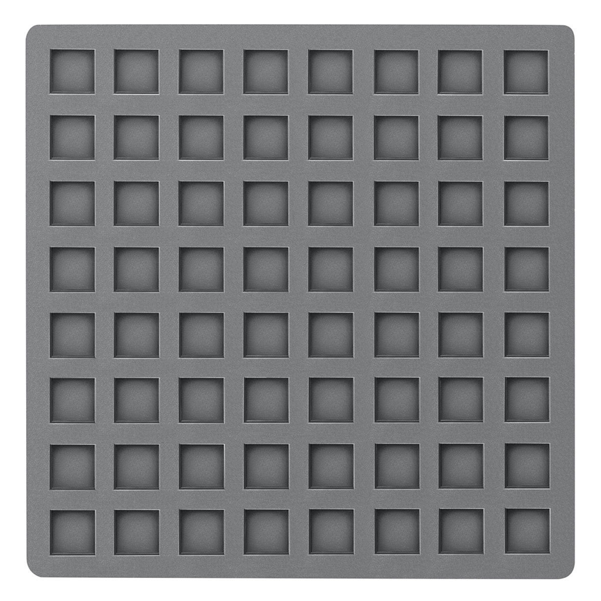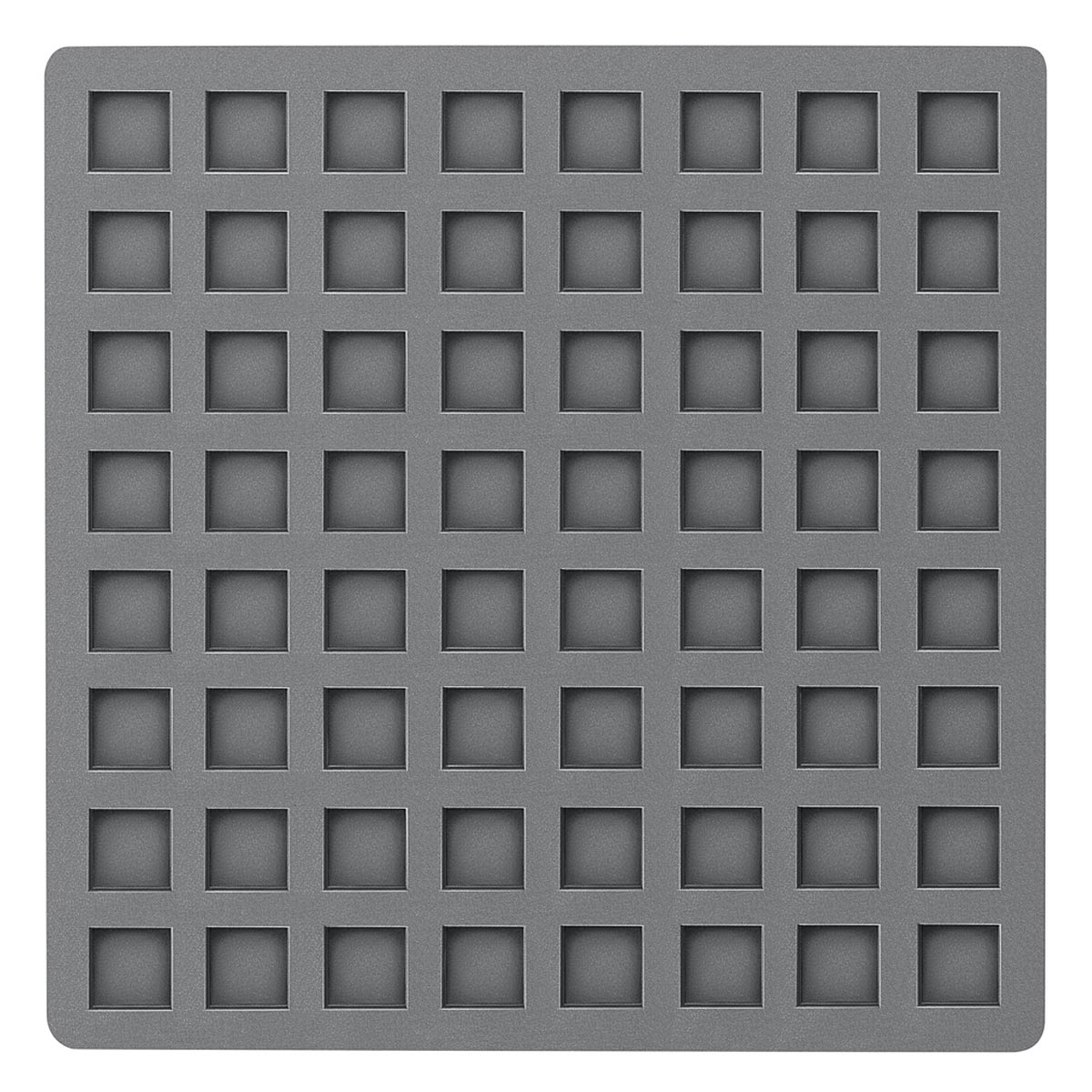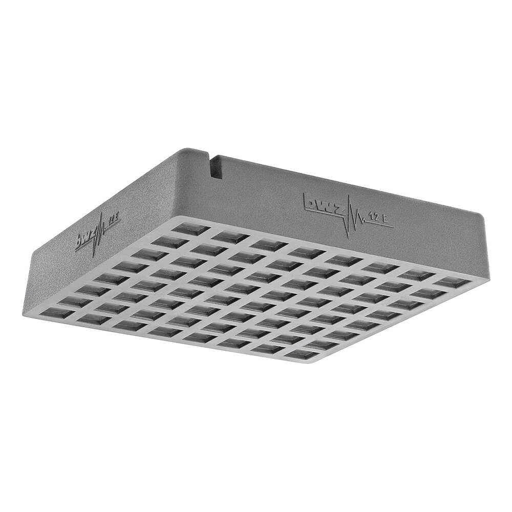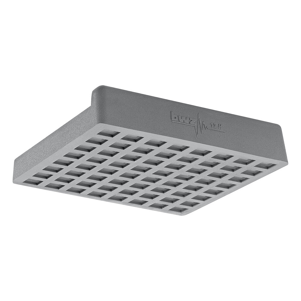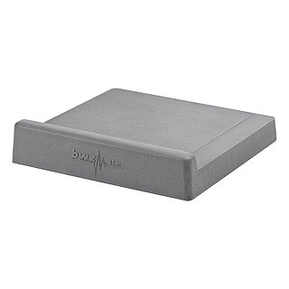 ein mittelgroßes hellgraues quadratisches Elastomer-Formstück in der Ansicht von der Seite und von oben mit zwei seitlichen Stegen und feinen parallelen Rillen auf der Oberfläche auf weißem Hintergrund