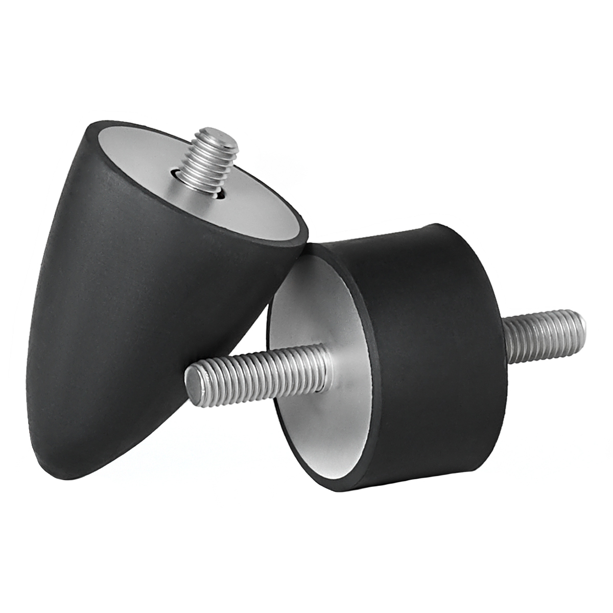 zwei Gummi-Metall-Elemente mit Außengewinden und schwarzem Elastomerkorpus, freigestellt auf weißem Hintergrund