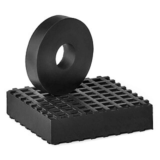 eine schwarze, quadratische Gummiplatte aus Elastomer NBR mit kleinen quadratischen Vertiefungen auf der Oberfläche als Gleitschutzprofil, darüber eine hochkant aufgestellte schwarze, runde und glatte Gummischeibe aus Elastomer NBR mit Loch in der Mitte, freigestellt auf weißem Hintergrund