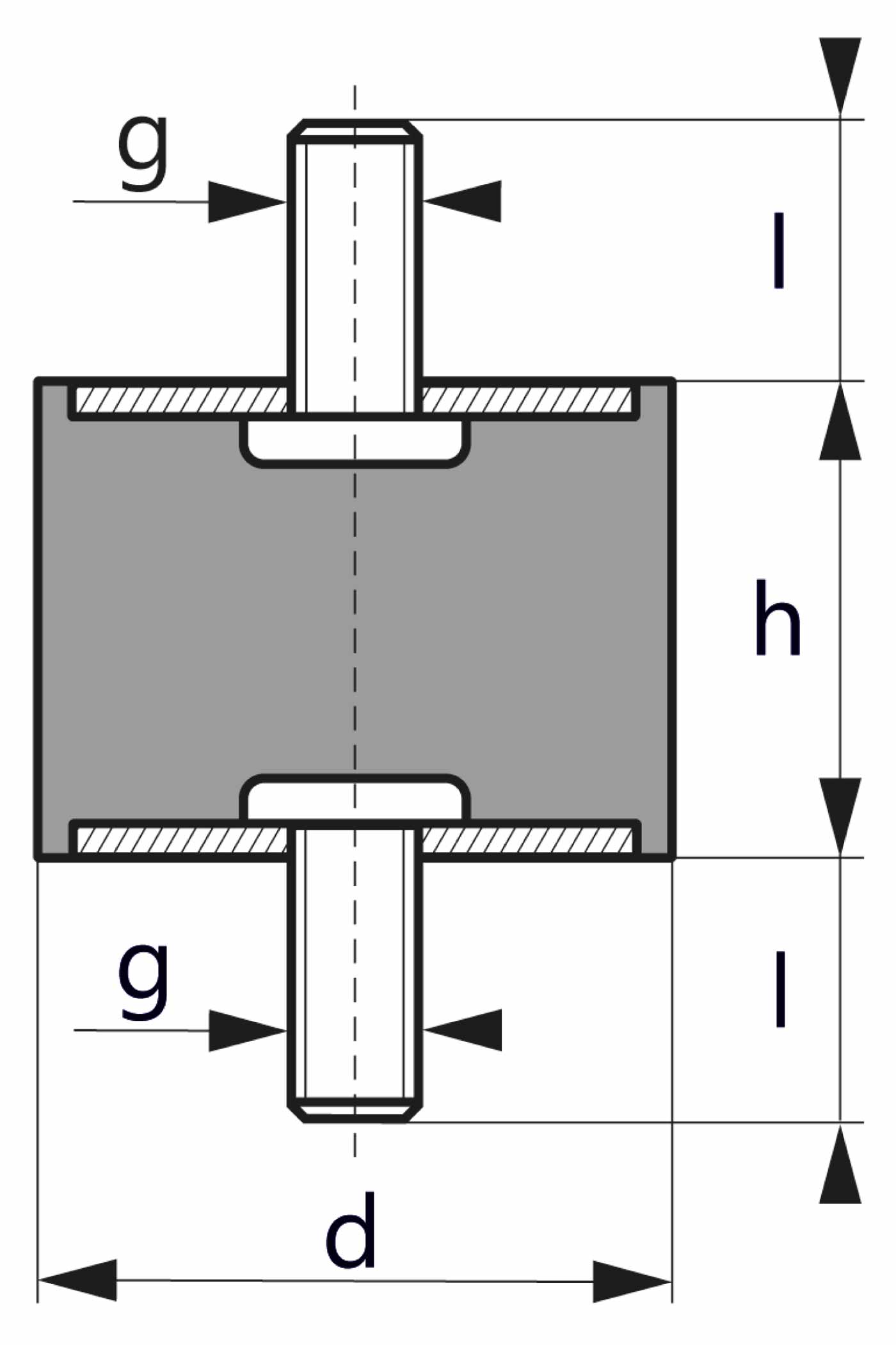 schematische Zeichnung eines Gummi-Metall-Elementes mit beidseitigem Außengewinde und dazwischenliegendem zylindrischem Elastomerkorpus