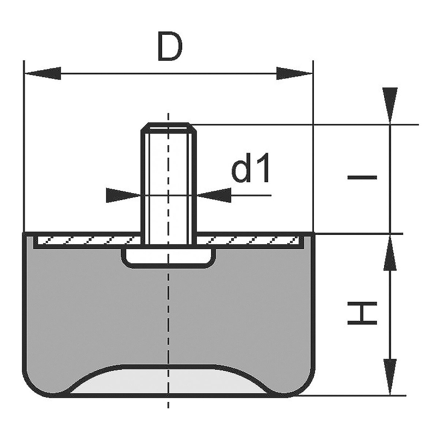 schematische Zeichnung eines Gummi-Metall-Elementes mit einseitigem Außengewinde und zylindrischem Elastomerkorpus mit Saugvertiefung