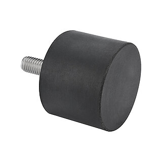 ein Gummi-Metall-Element mit einseitigem Außengewinde und schwarzem zylindrischen Elastomerkorpus, freigestellt auf weißem Hintergrund