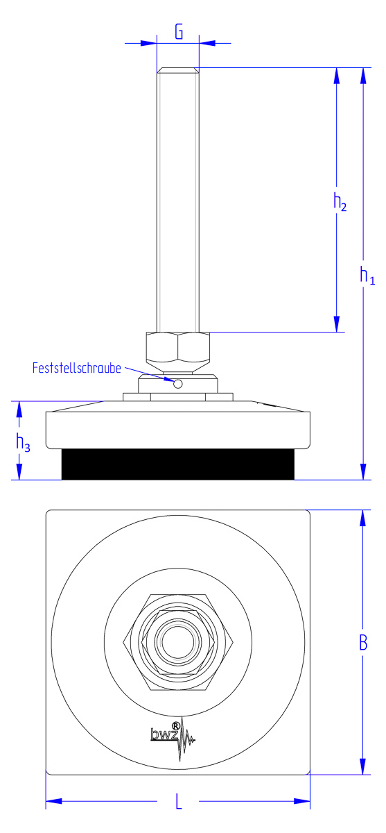 BezeichnungArtikelnummerL / B(mm)h1 (mm)h2 (mm)h3 (mm)G(Gewinde)SW(mm)Shorehärte (±5 Shore)Belastung (daN)