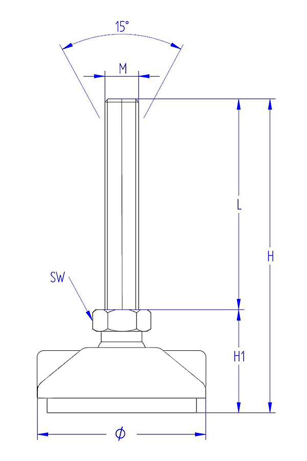 | Ausführung Edelstahl | Artikelnummer | Ø(mm) | M | SW(mm) | H(mm) | L(mm) | H1(mm) | *Shorehärte(+/- 5) | Belastung max.(daN) |