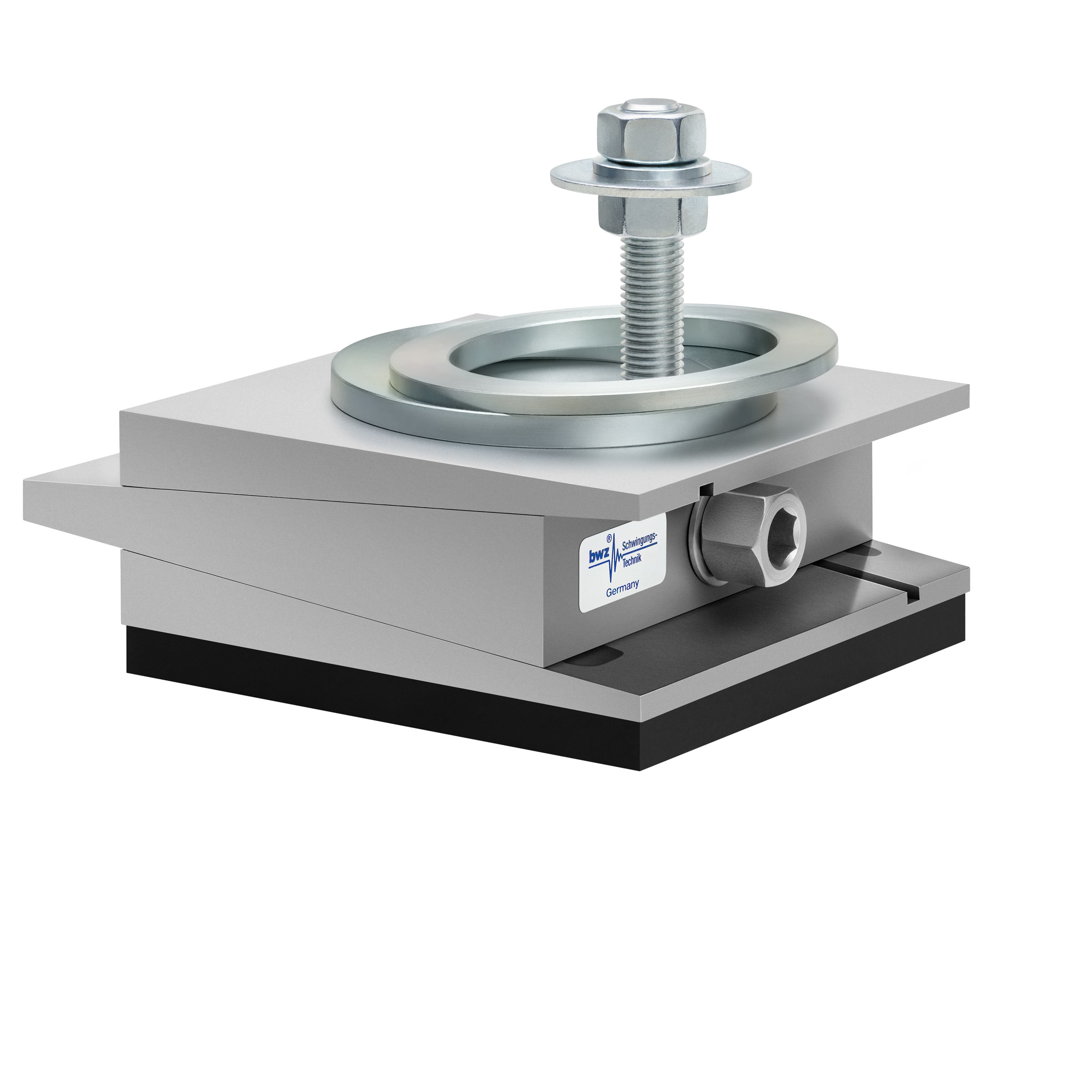 Die Präzisionskeilschuhe anschraubbar (BO) mit Kalotte sind vorgesehen für eine Befestigung am Maschinenrahmen und Ausgleich von Winkelfehlern. Beim Transport werden die Keilschuhe mitgeführt. Anwendungsabhängig ist die Unterseite mit einer Dämpfungs- oder Gleitschutzplatte in unterschiedlicher Shorehärte und optionaler Profilierung bestückt.