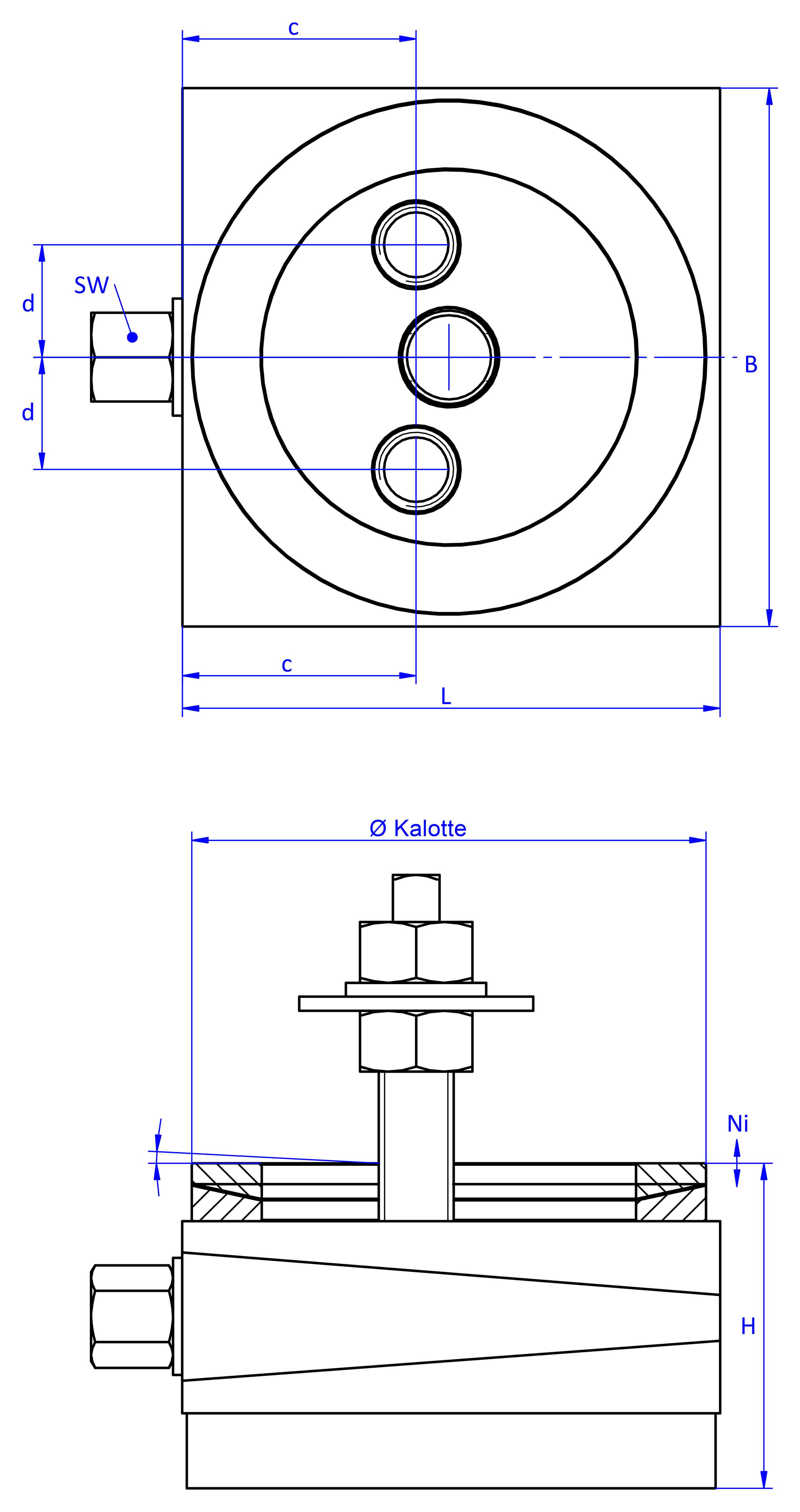 TypArtikelnummerBelastung (daN)L (mm)B (mm)H (mm)Ni (mm)SW (a/i)c (mm)d (mm)Gewinde (anschraubbar unten)Kalotte (Ø mm)Masse (Kg)