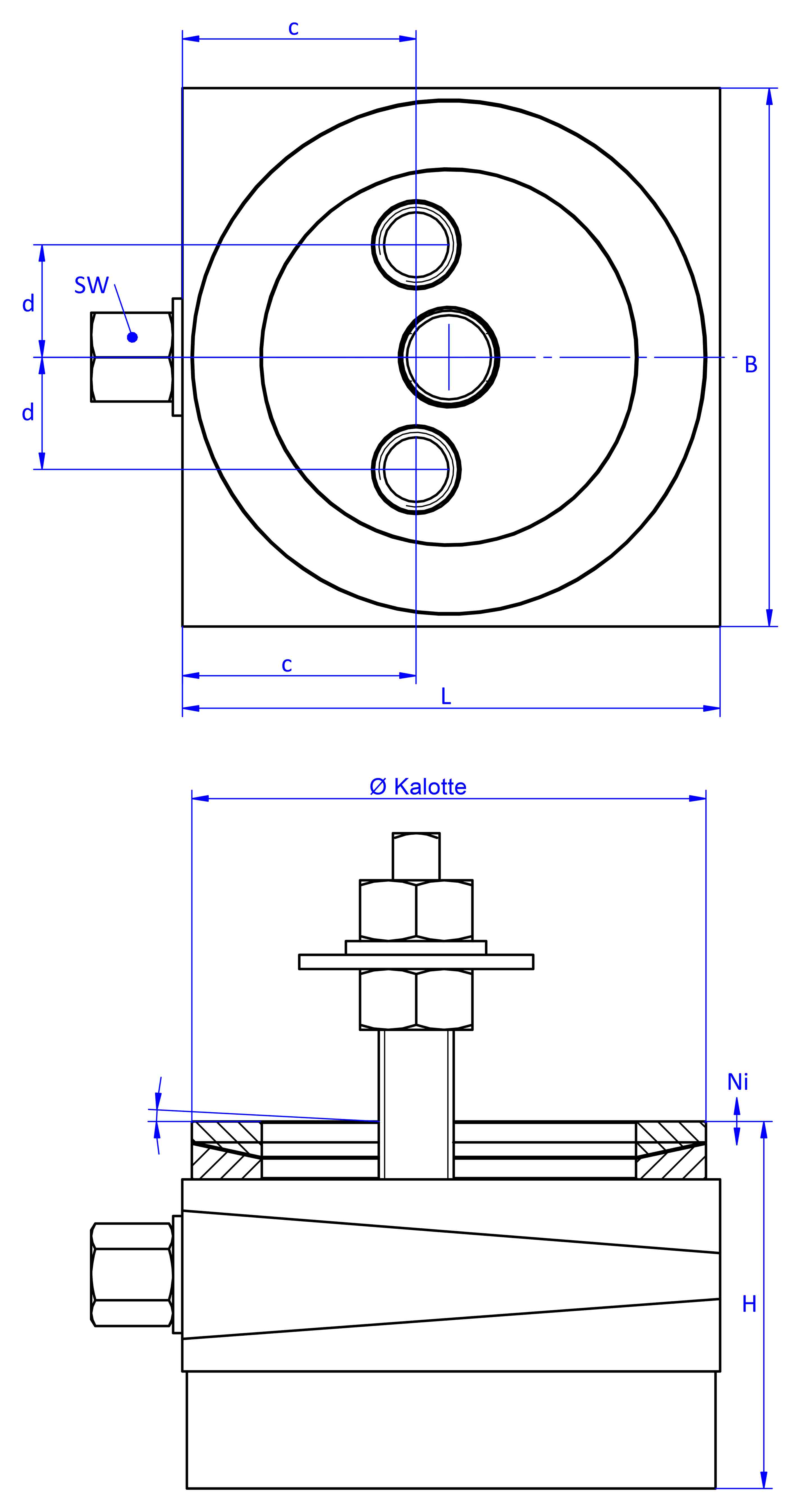TypArtikelnummerBelastung (daN)L (mm)B (mm)H (mm)Ni (mm)SW (a/i)c (mm)d (mm)Gewinde (anschraubbar unten)Kalotte (Ø mm)Masse (Kg)