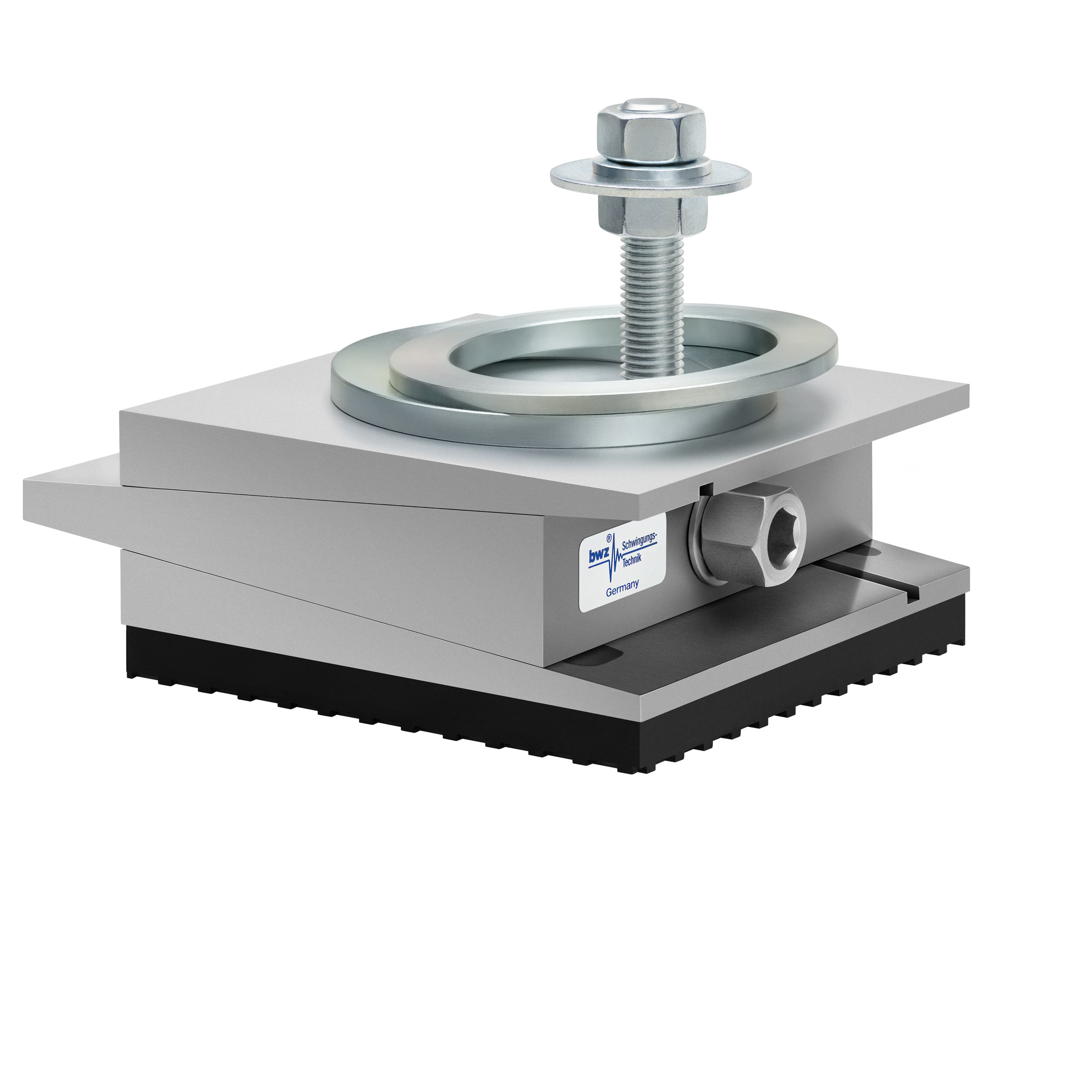 aus Ober-, Mittel- und Unterteil bestehender, quadratischer, höhenverstellbarer Maschinenschuh aus plangefrästem Metall, eingestellt auf mittlere Höhe, silber-grau lackiert, mit keilförmigem Mittelteil mit mittig auf der Seite platzierter Sechskantschraube zur Höhenverstellung, einer aus zwei sphärischen, gerade aufeinander liegenden Metallringen bestehenden Winkelkalotte auf dem Oberteil, einer im Unterteil verschraubten Befestigungsschraube und mitteldickem, schwarzem Elastomer ohne Profilierung zur passiven Schwingungsisolierung unten, freigestellt auf weißem Hintergrund