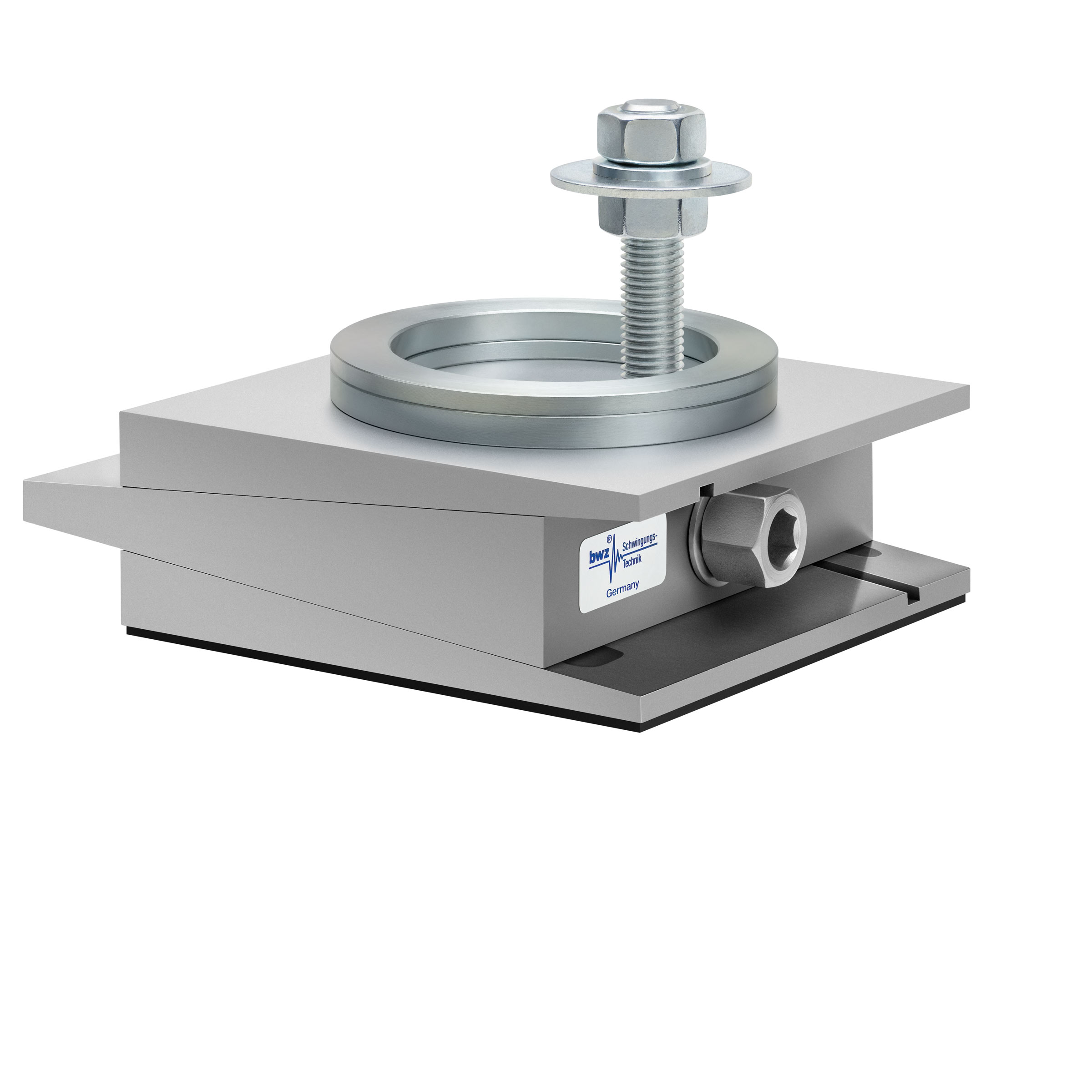 aus Ober-, Mittel- und Unterteil bestehender, quadratischer, höhenverstellbarer Maschinenschuh aus plangefrästem Metall, eingestellt auf mittlere Höhe, silber-grau lackiert, mit keilförmigem Mittelteil mit mittig auf der Seite platzierter Sechskantschraube zur Höhenverstellung, einer aus zwei sphärischen, gerade aufeinander liegenden Metallringen bestehenden Winkelkalotte auf dem Oberteil, einer im Unterteil verschraubten Befestigungsschraube und mitteldickem, schwarzem Elastomer mit Profilierung zur Schwingungsisolierung unten, freigestellt auf weißem Hintergrund