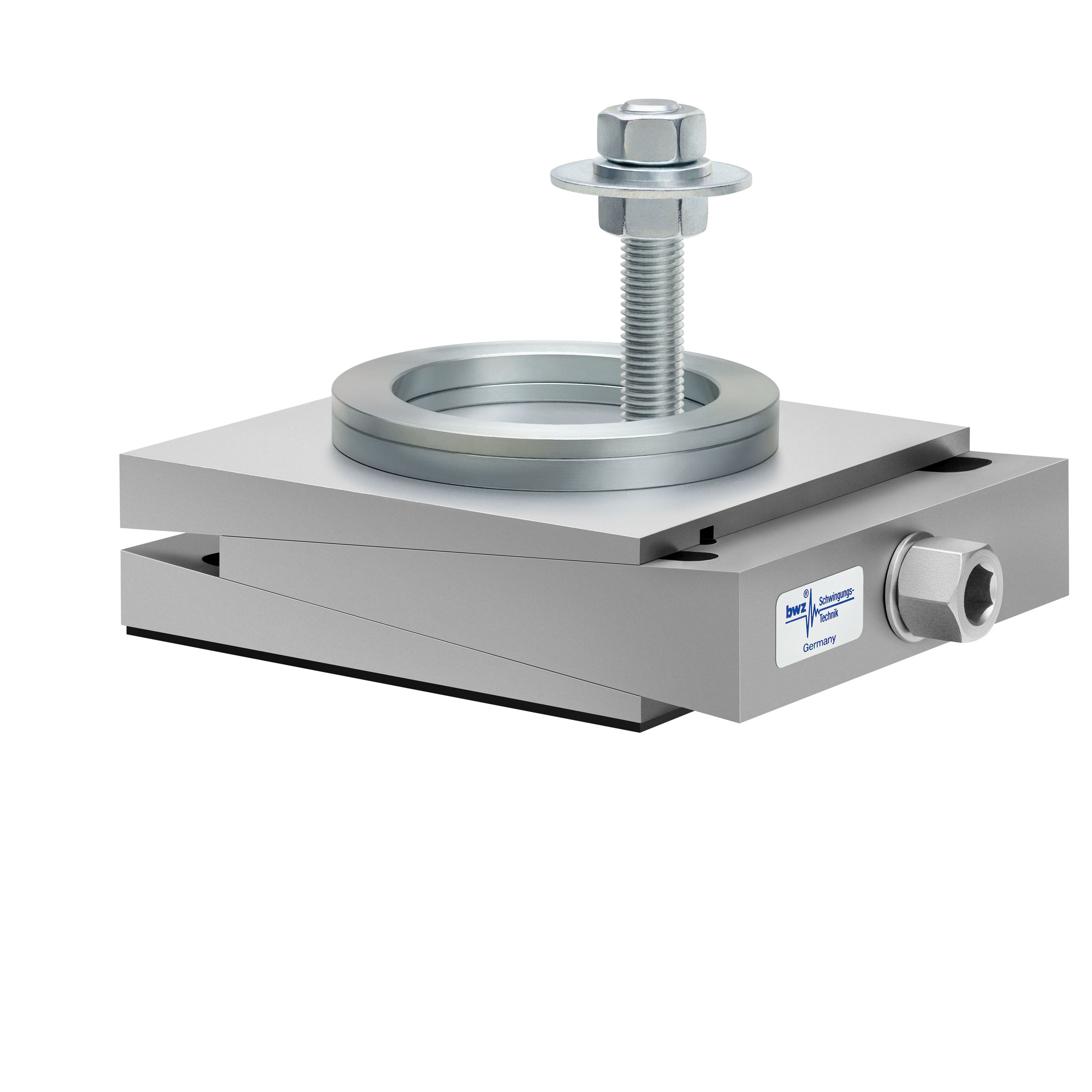 aus Ober-, Mittel- und Unterteil bestehender, quadratischer, höhenverstellbarer Maschinenschuh aus plangefrästem Metall, eingestellt auf mittlere Höhe, silber-grau lackiert, mit keilförmigem Mittelteil mit mittig auf der Seite platzierter Sechskantschraube zur Höhenverstellung, einer aus zwei sphärischen, gerade aufeinander liegenden Metallringen bestehenden Winkelkalotte auf dem Oberteil und einer im Unterteil verschraubten Befestigungsschraube, freigestellt auf weißem Hintergrund