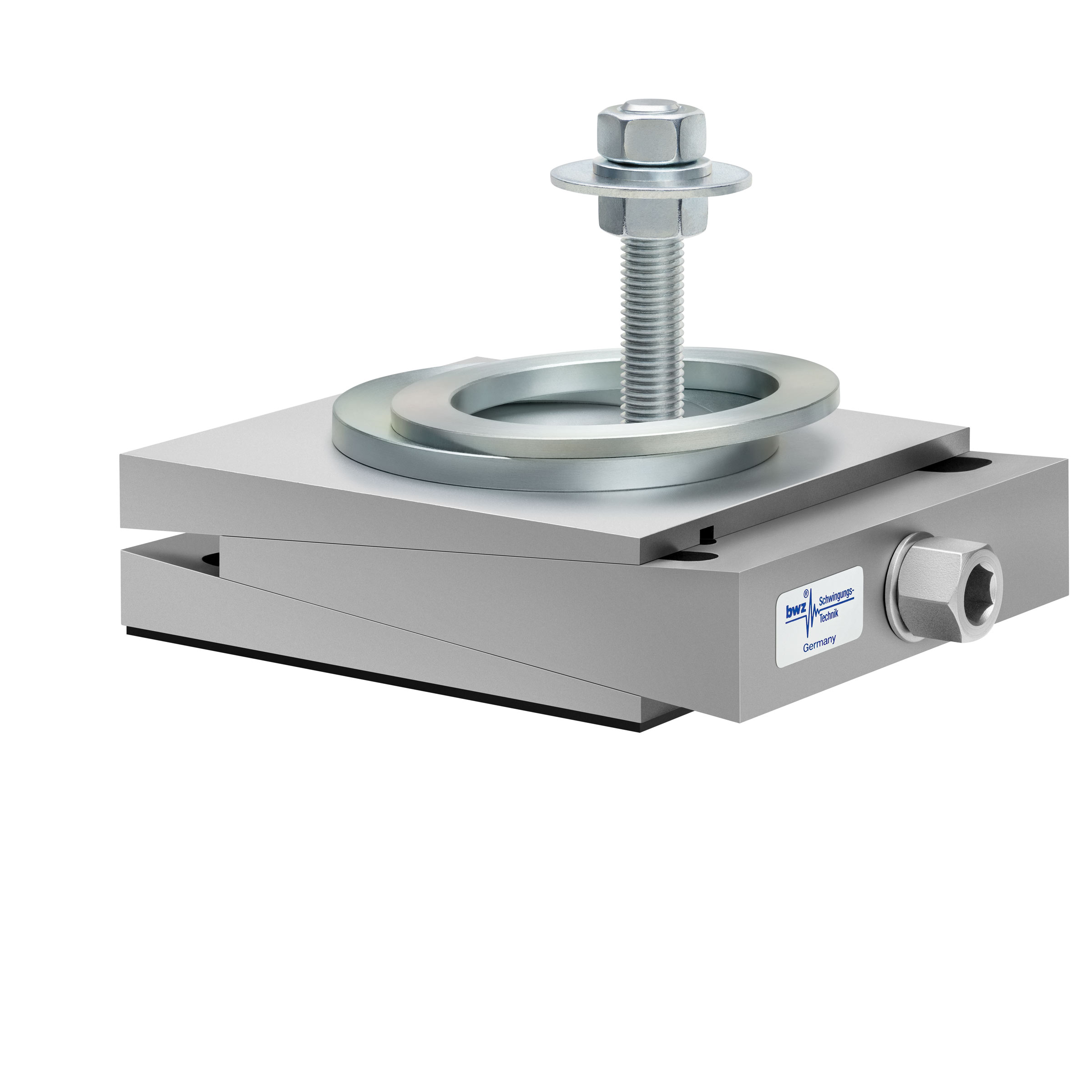 aus Ober-, Mittel- und Unterteil bestehender, quadratischer, höhenverstellbarer Maschinenschuh aus plangefrästem Metall, eingestellt auf mittlere Höhe, silber-grau lackiert, mit keilförmigem Mittelteil mit mittig auf der Seite platzierter Sechskantschraube zur Höhenverstellung, einer aus zwei sphärischen, gerade aufeinander liegenden Metallringen bestehenden Winkelkalotte auf dem Oberteil, einer im Unterteil verschraubten Befestigungsschraube und dickem, schwarzem Elastomer mit Profilierung zur Schwingungsisolierung unten, freigestellt auf weißem Hintergrund