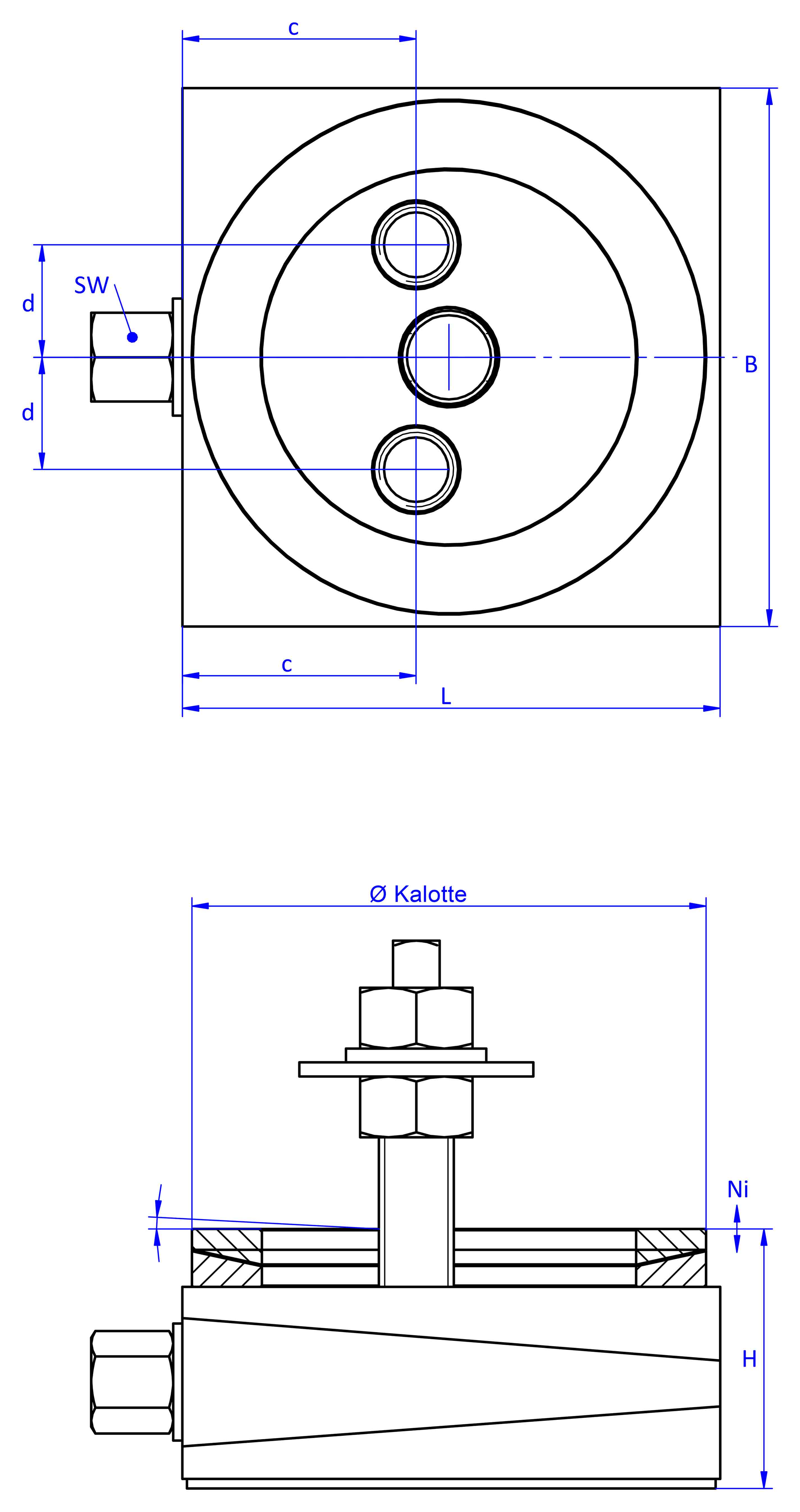 TypArtikelnummerBelastung (daN)L (mm)B (mm)H (mm)Ni (mm)SW (a/i)c (mm)d (mm)Gewinde (anschraubbar unten)Kalotte (Ø mm)Masse (Kg)