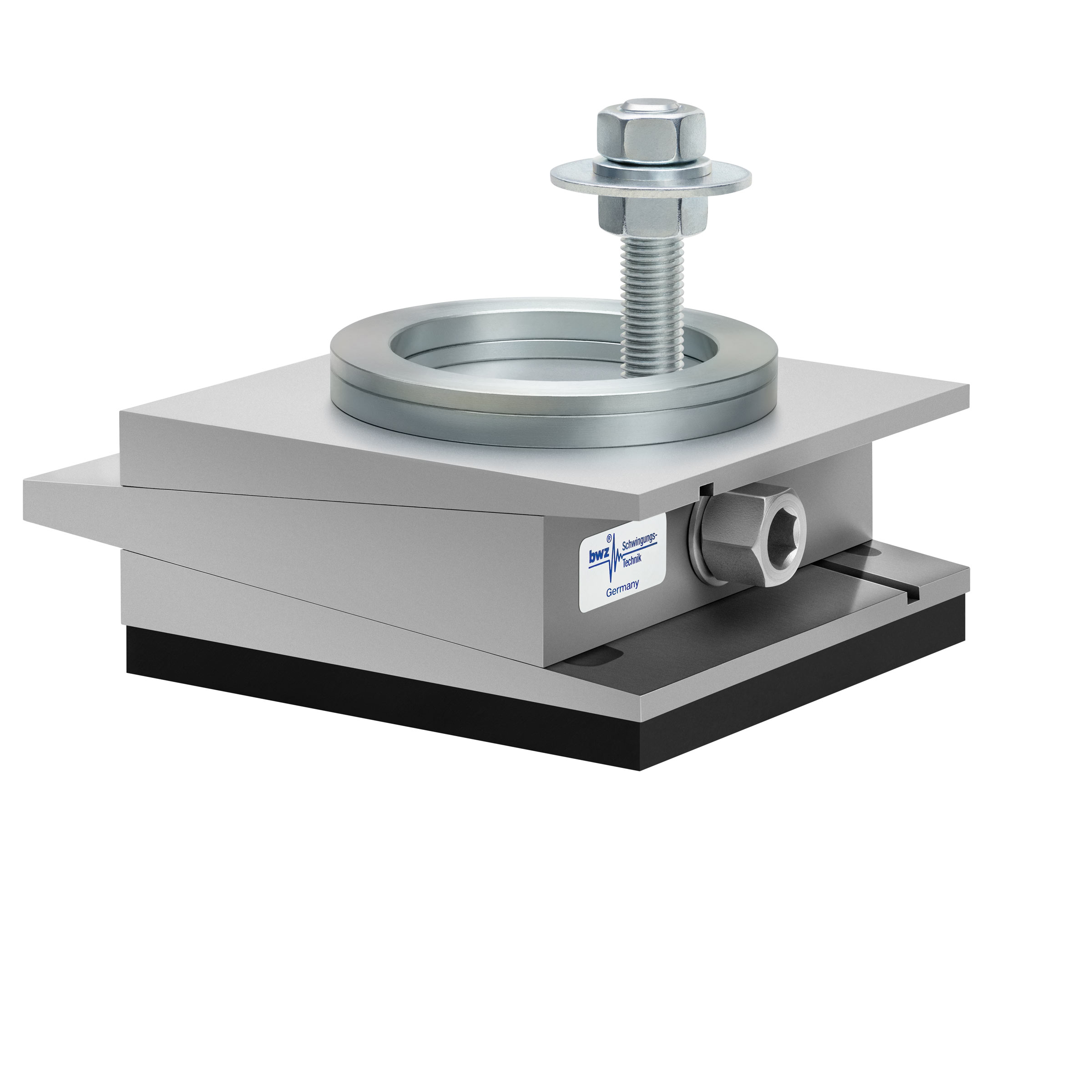 aus Ober-, Mittel- und Unterteil bestehender, quadratischer, höhenverstellbarer Maschinenschuh aus plangefrästem Metall, eingestellt auf mittlere Höhe, silber-grau lackiert, mit keilförmigem Mittelteil mit mittig auf der Seite platzierter Sechskantschraube zur Höhenverstellung, einer aus zwei sphärischen, gerade aufeinander liegenden Metallringen bestehenden Winkelkalotte auf dem Oberteil, einer im Unterteil verschraubten Befestigungsschraube und mitteldickem, schwarzem Elastomer mit Profilierung zur Schwingungsisolierung unten, freigestellt auf weißem Hintergrund