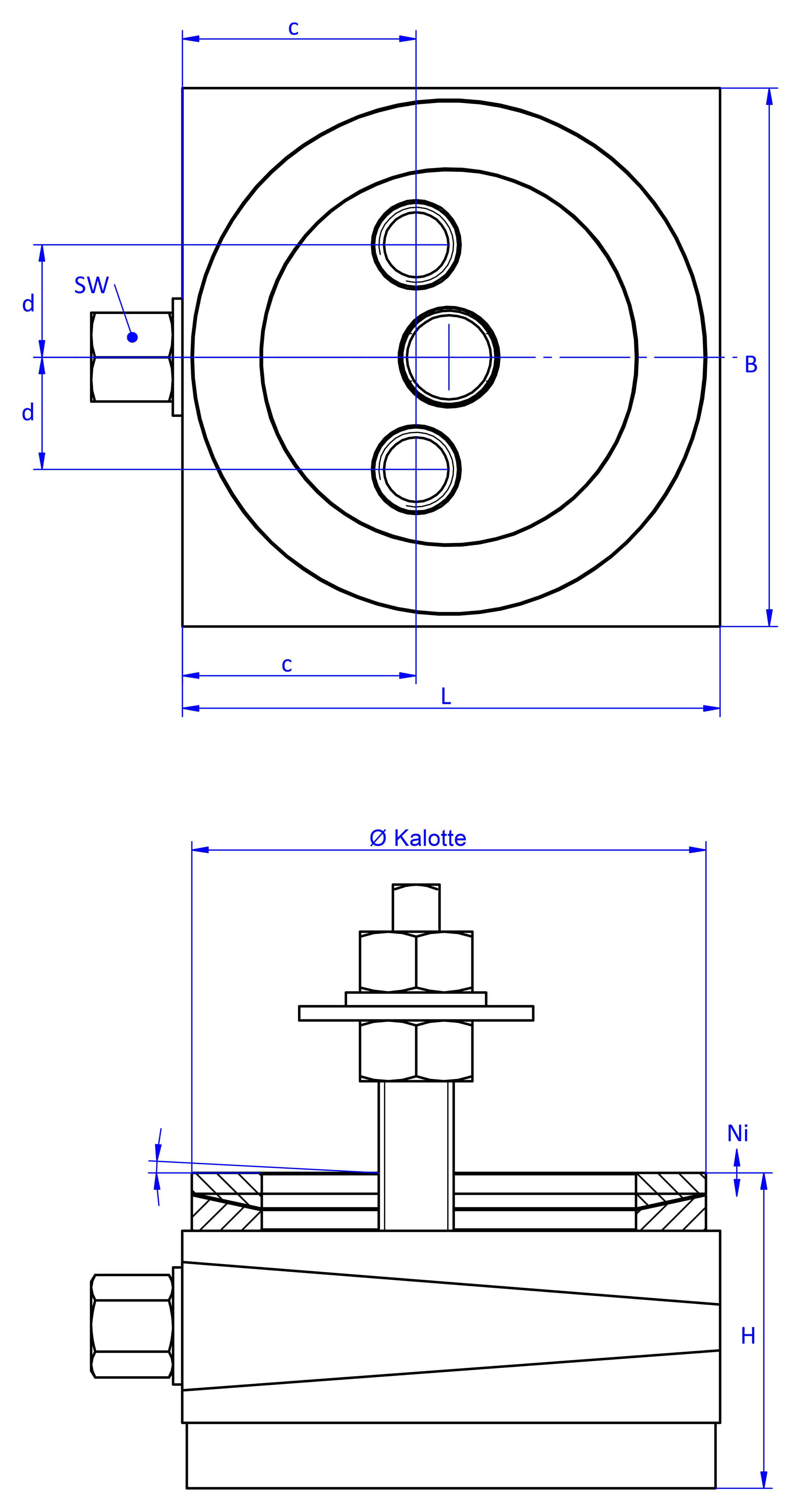 TypArtikelnummerBelastung (daN)L (mm)B (mm)H (mm)Ni (mm)SW (a/i)c (mm)d (mm)Gewinde (anschraubbar unten)Kalotte (Ø mm)Masse (Kg)