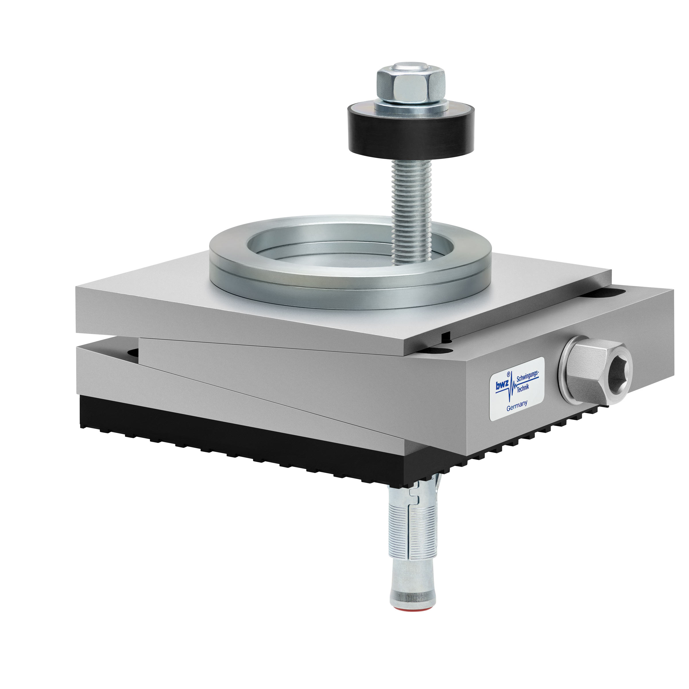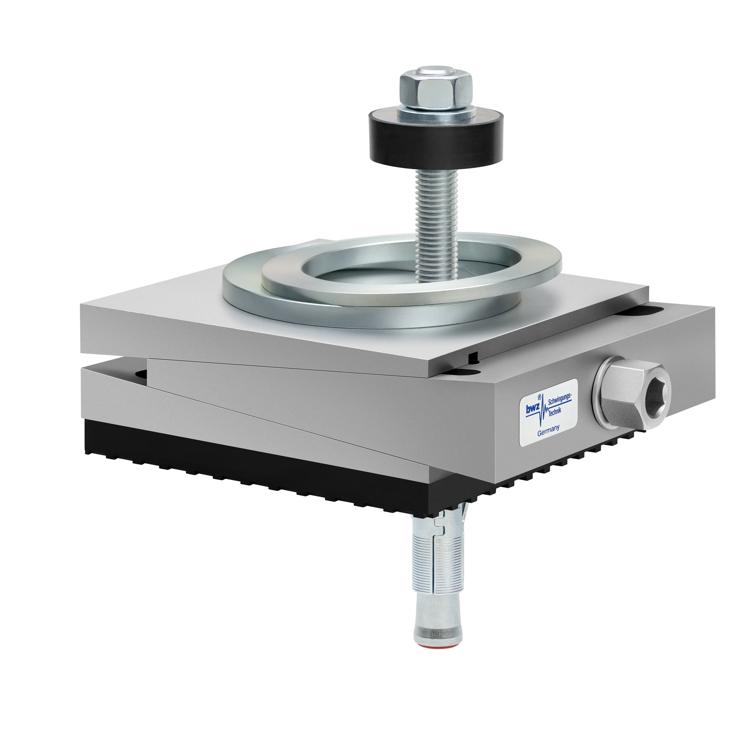 aus Ober-, Mittel- und Unterteil bestehender, quadratischer, höhenverstellbarer Maschinenschuh aus plangefrästem Metall, eingestellt auf mittlere Höhe, silber-grau lackiert, mit keilförmigem Mittelteil mit mittig auf der Seite platzierter Sechskantschraube zur Höhenverstellung, einer aus zwei sphärischen, gerade aufeinander liegenden Metallringen bestehenden Winkelkalotte auf dem Oberteil, einer durch das Unterteil durchgehenden, nach oben herausragenden Befestigungsschraube mit Isolierscheibe, mitteldickem, schwarzem Elastomer ohne Profilierung zur passiven Schwingungsisolierung unten und darunter ein verzinkter Dübel zur Bodenbefestigung, freigestellt auf weißem Hintergrund