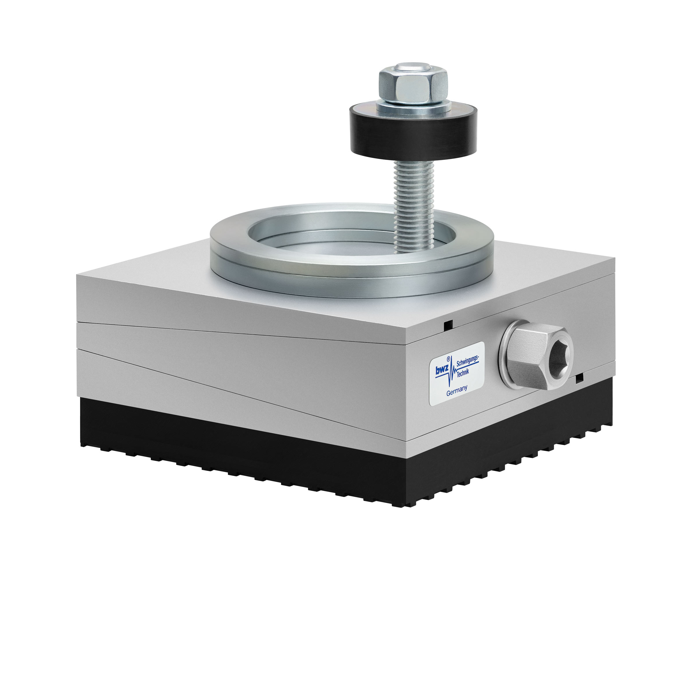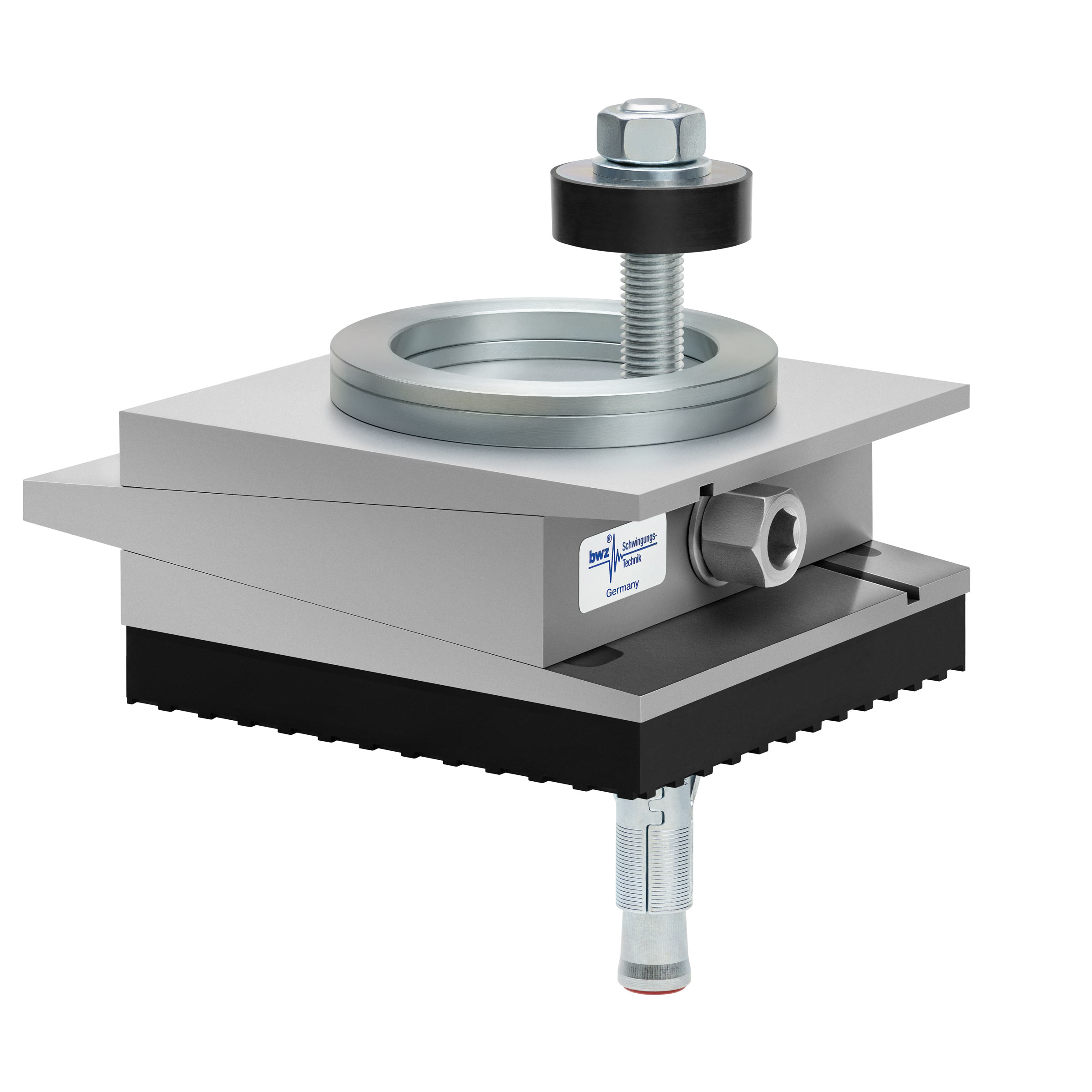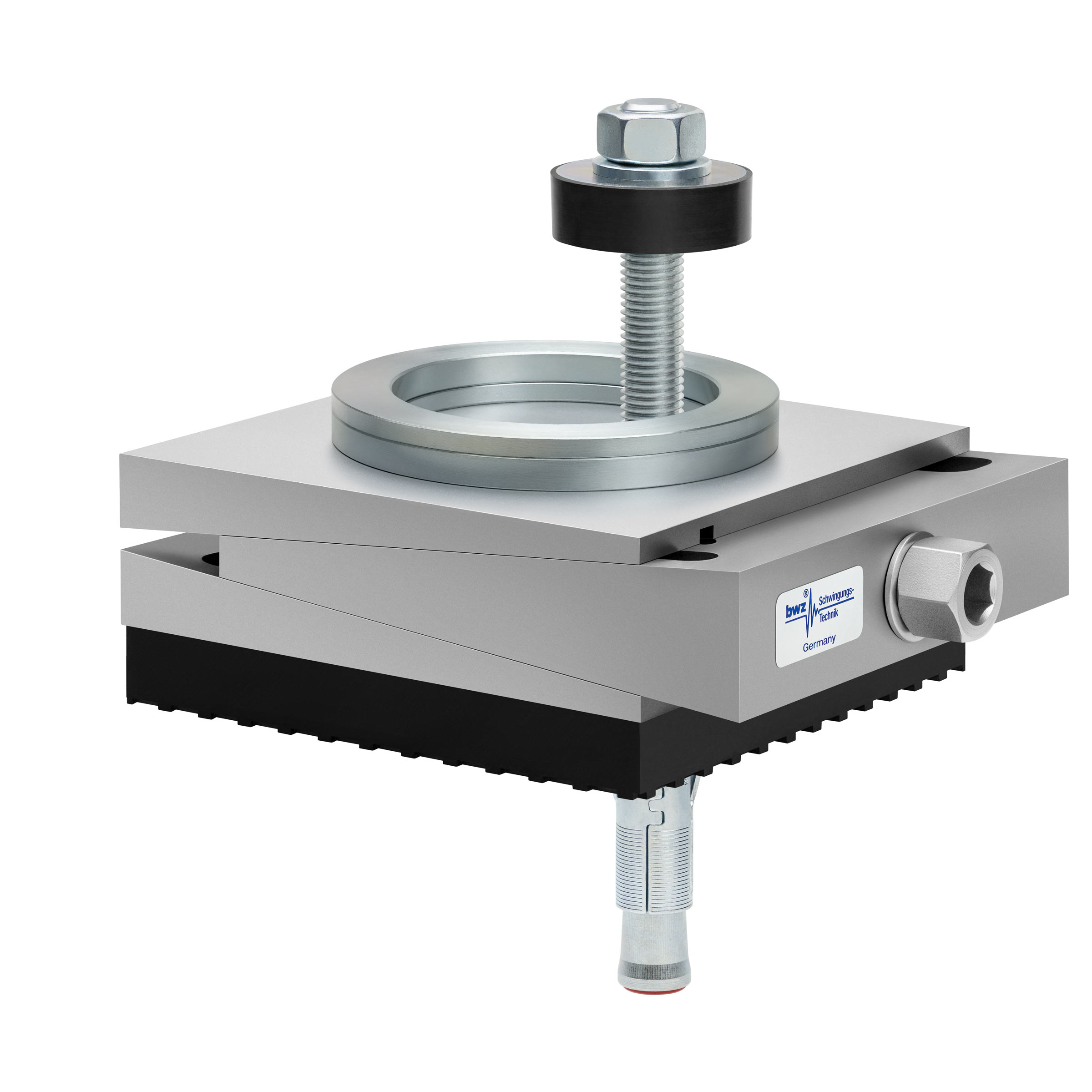 Die Präzisionskeilschuhe durchschraubbar (BT) mit Kalotte sind vorgesehen für eine Verankerung der Maschine im Boden und Ausgleich von Winkelfehlern. Anwendungsabhängig ist die Unterseite mit einer Dämpfungs- oder Gleitschutzplatte in unterschiedlicher Shorehärte und optionaler Profilierung bestückt.