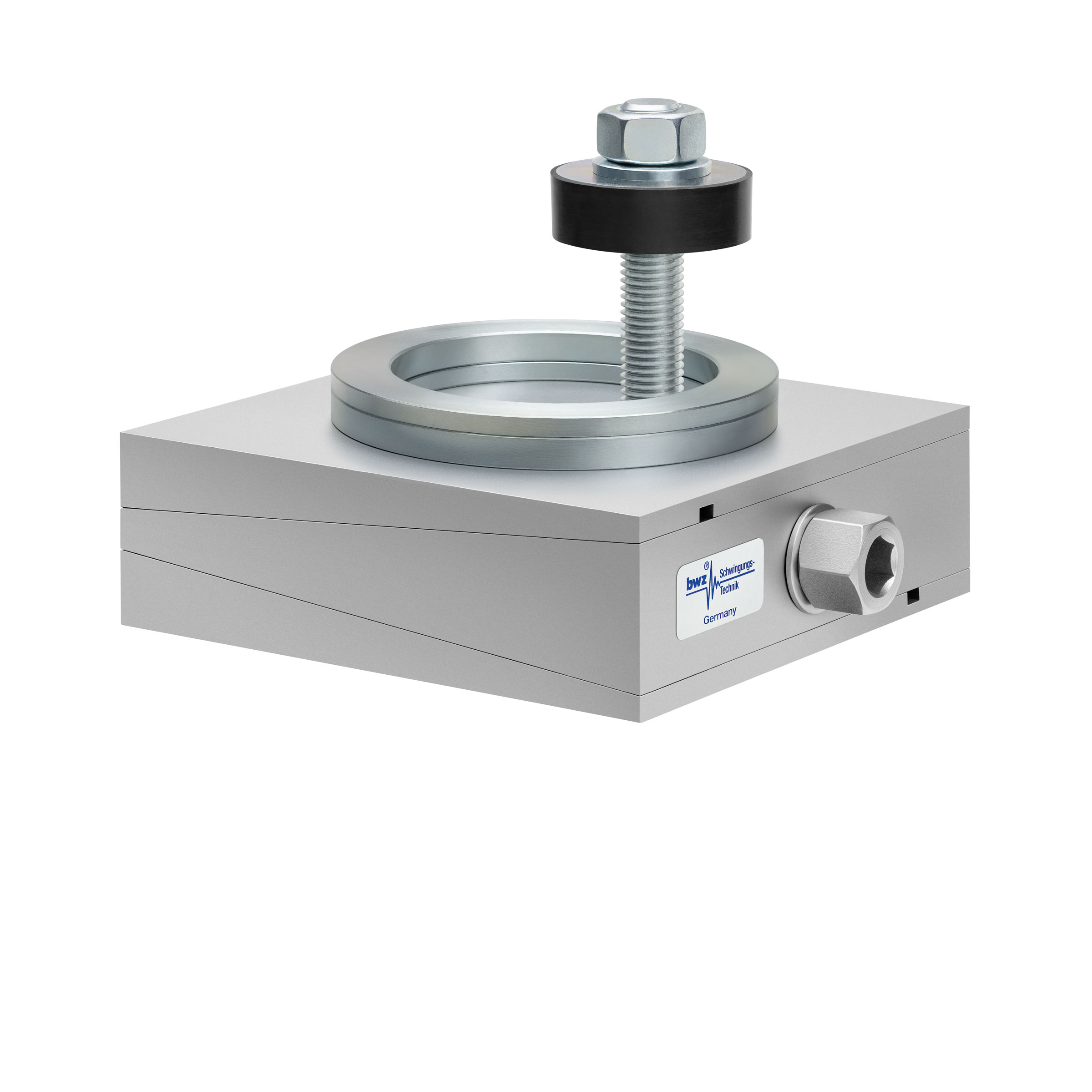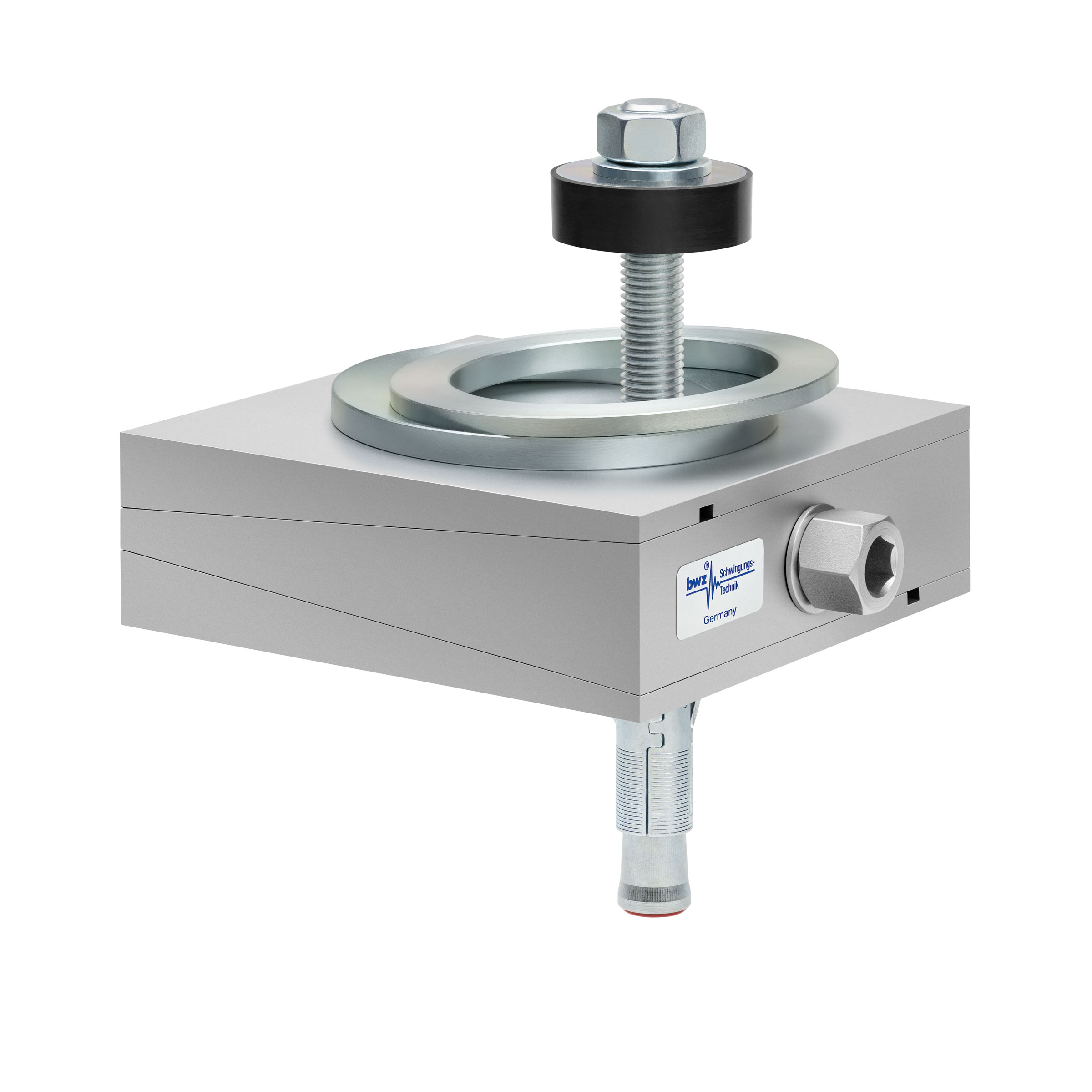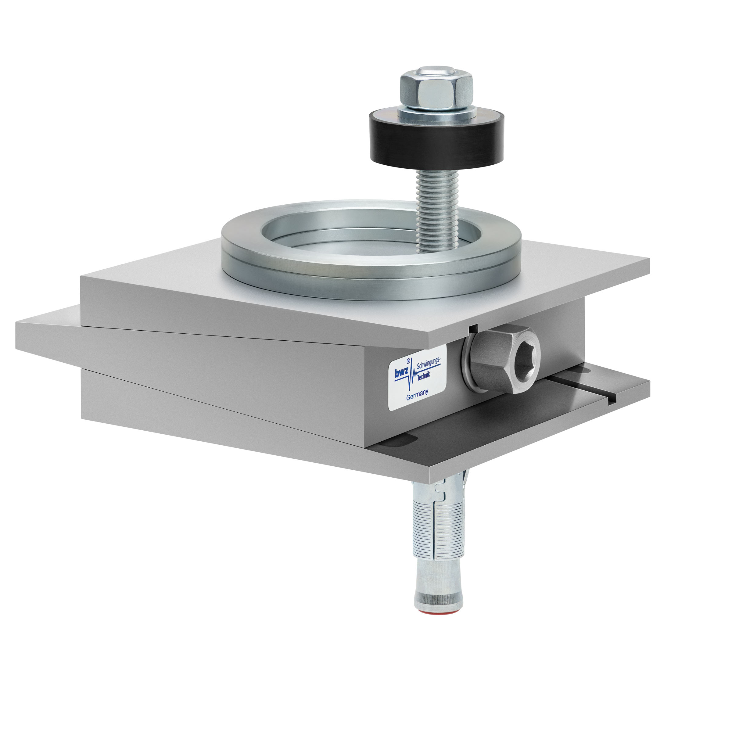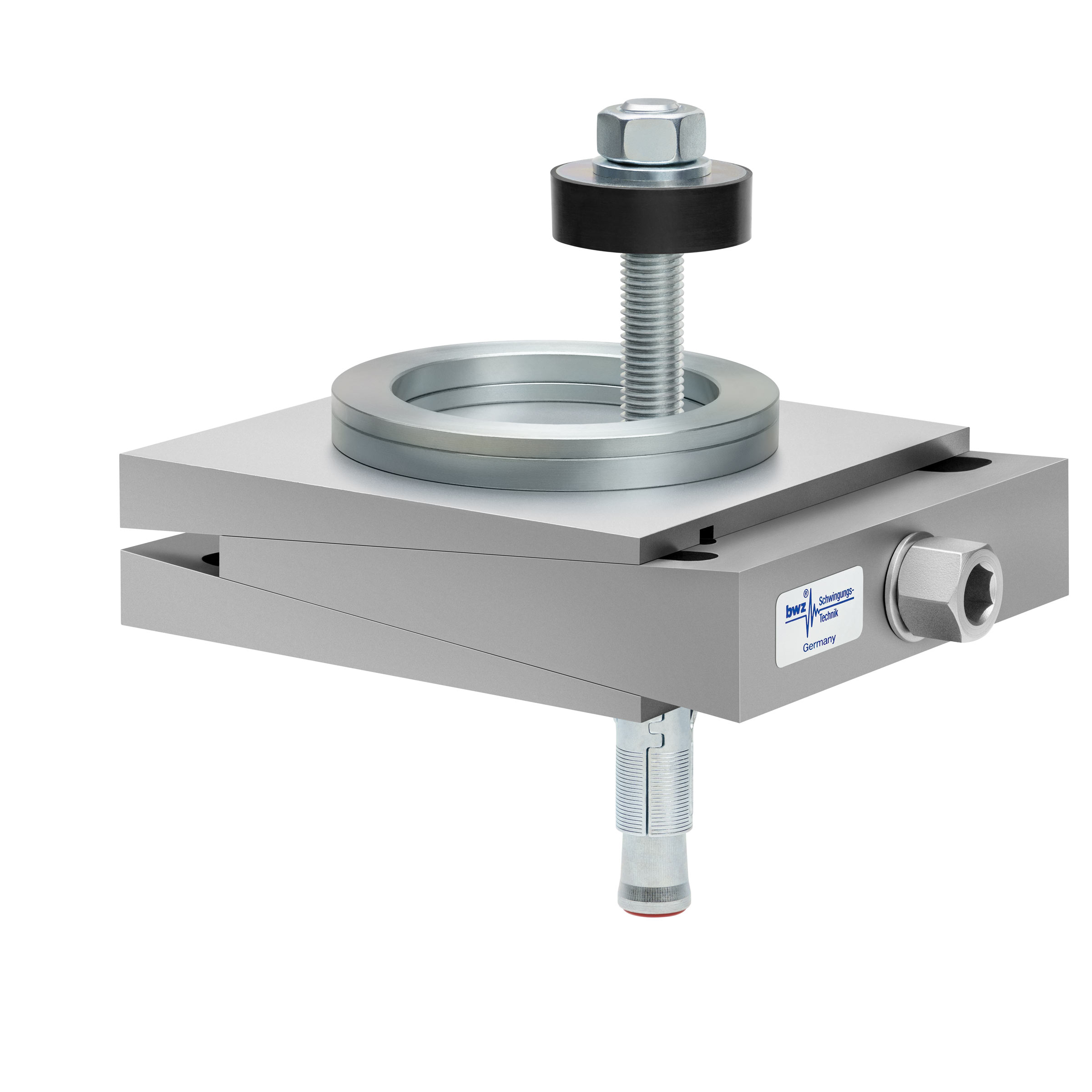 aus Ober-, Mittel- und Unterteil bestehender, quadratischer, höhenverstellbarer Maschinenschuh aus plangefrästem Metall, eingestellt auf mittlere Höhe, silber-grau lackiert, mit keilförmigem Mittelteil mit mittig auf der Seite platzierter Sechskantschraube zur Höhenverstellung, einer aus zwei sphärischen, gerade aufeinander liegenden Metallringen bestehenden Winkelkalotte auf dem Oberteil, einer durch das Unterteil durchgehenden, nach oben herausragenden Befestigungsschraube mit Isolierscheibe, mitteldickem, schwarzem Elastomer ohne Profilierung zur passiven Schwingungsisolierung unten und darunter ein verzinkter Dübel zur Bodenbefestigung, freigestellt auf weißem Hintergrund