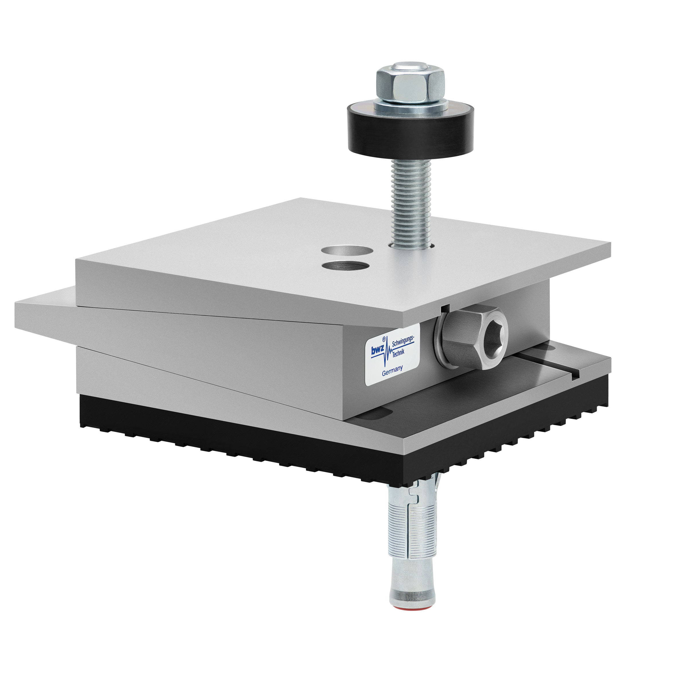 aus Ober-, Mittel- und Unterteil bestehender, quadratischer, höhenverstellbarer Maschinenschuh aus plangefrästem Metall, eingestellt auf mittlere Höhe, silber-grau lackiert, mit keilförmigem Mittelteil mit mittig auf der Seite platzierter Sechskantschraube zur Höhenverstellung, einer aus zwei sphärischen, gerade aufeinander liegenden Metallringen bestehenden Winkelkalotte auf dem Oberteil, einer durch das Unterteil durchgehenden, nach oben herausragenden Befestigungsschraube mit Isolierscheibe und darunter ein verzinkter Dübel zur Bodenbefestigung, freigestellt auf weißem Hintergrund
