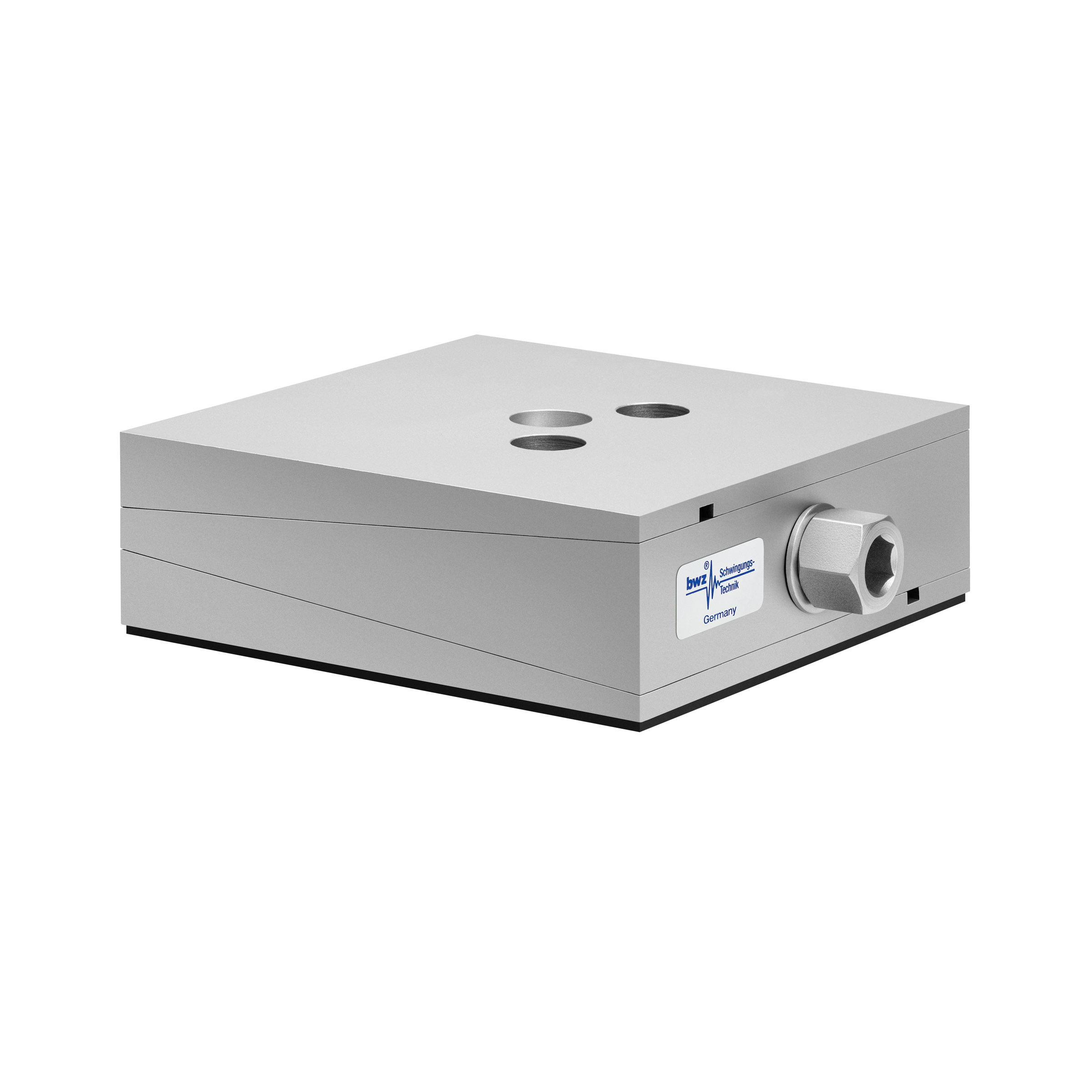 aus Ober-, Mittel- und Unterteil bestehender, quadratischer, höhenverstellbarer Maschinenschuh aus plangefrästem Metall, eingestellt auf mittlere Höhe, silber-grau lackiert, mit keilförmigem Mittelteil mit mittig auf der Seite platzierter Sechskantschraube zur Höhenverstellung, zwei Löchern für Befestigungsschrauben im Oberteil, einer durch das Unterteil durchgehenden, nach oben herausragenden Befestigungsschraube mit Isolierscheibe, mitteldickem, schwarzem Elastomer ohne Profilierung zur passiven Schwingungsisolierung unten und darunter einem verzinktem Bodendübel, freigestellt auf weißem Hintergrund