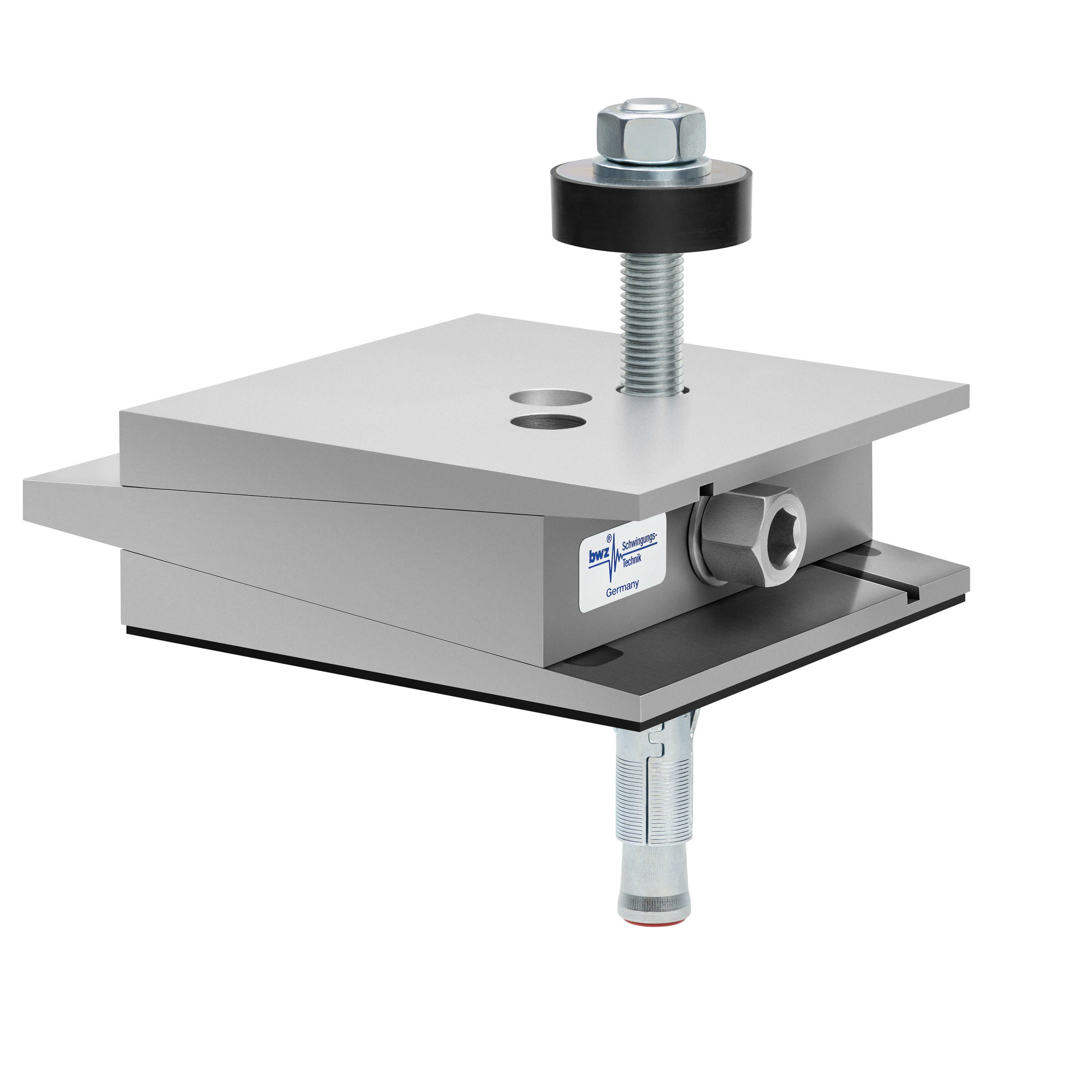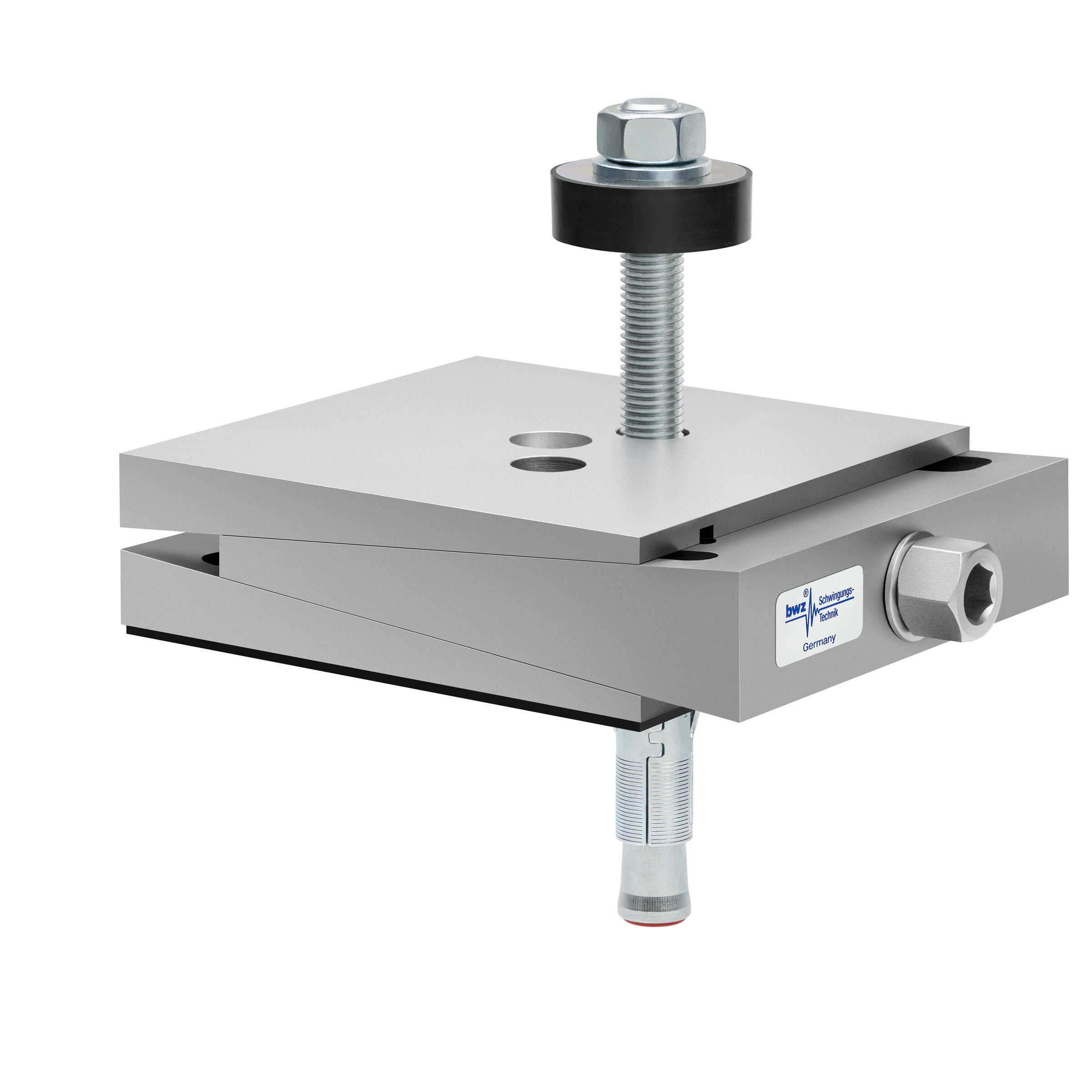 aus Ober-, Mittel- und Unterteil bestehender, quadratischer, höhenverstellbarer Maschinenschuh aus plangefrästem Metall, eingestellt auf mittlere Höhe, silber-grau lackiert, mit keilförmigem Mittelteil mit mittig auf der Seite platzierter Sechskantschraube zur Höhenverstellung, einer aus zwei sphärischen, gerade aufeinander liegenden Metallringen bestehenden Winkelkalotte auf dem Oberteil, einer durch das Unterteil durchgehenden, nach oben herausragenden Befestigungsschraube mit Isolierscheibe und darunter ein verzinkter Dübel zur Bodenbefestigung, freigestellt auf weißem Hintergrund