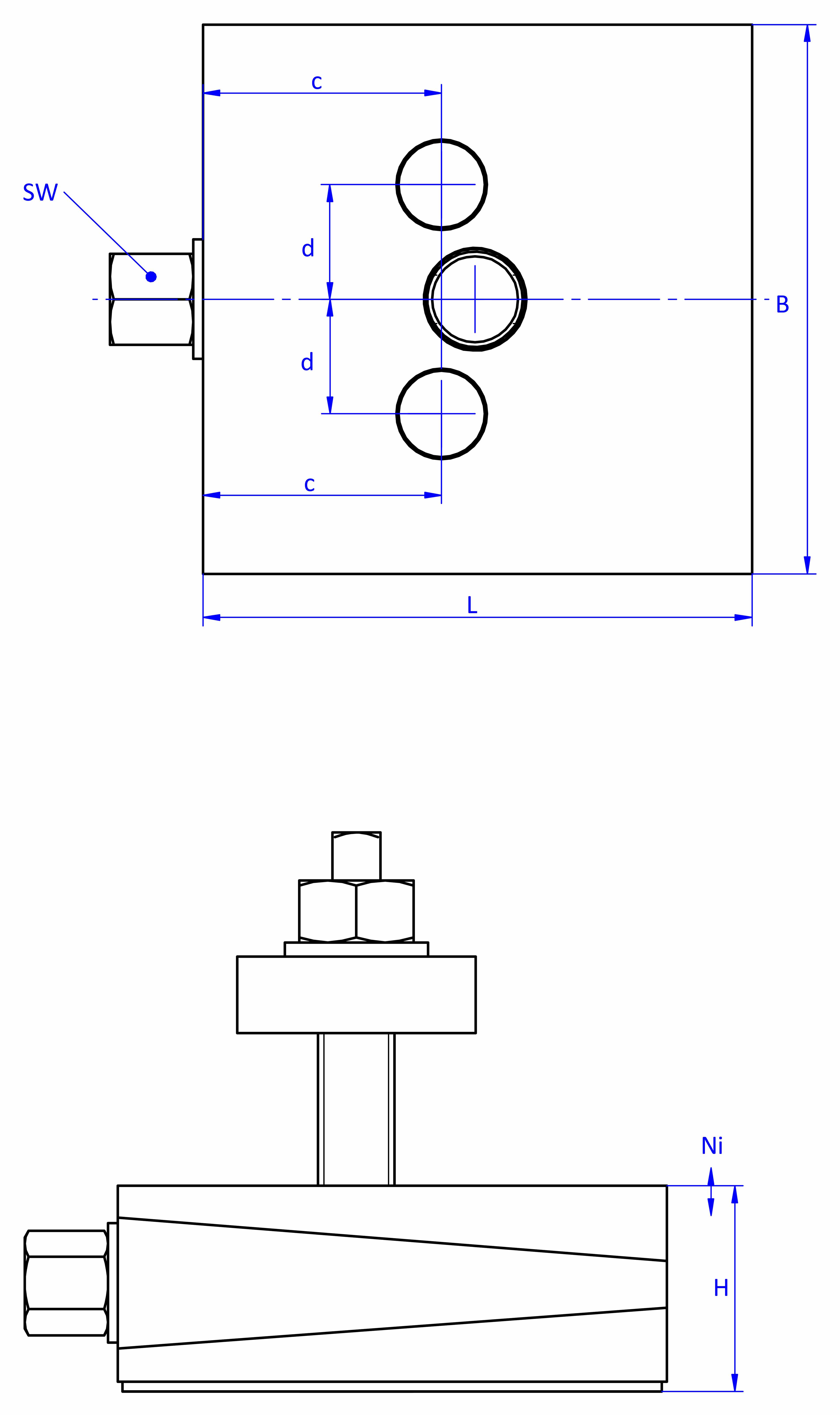 TypArtikelnummerBelastung (daN)L (mm)B (mm)H (mm)Ni (mm)SW (a/i)c (mm)d (mm)Bohrung (Ø mm)Masse (Kg)