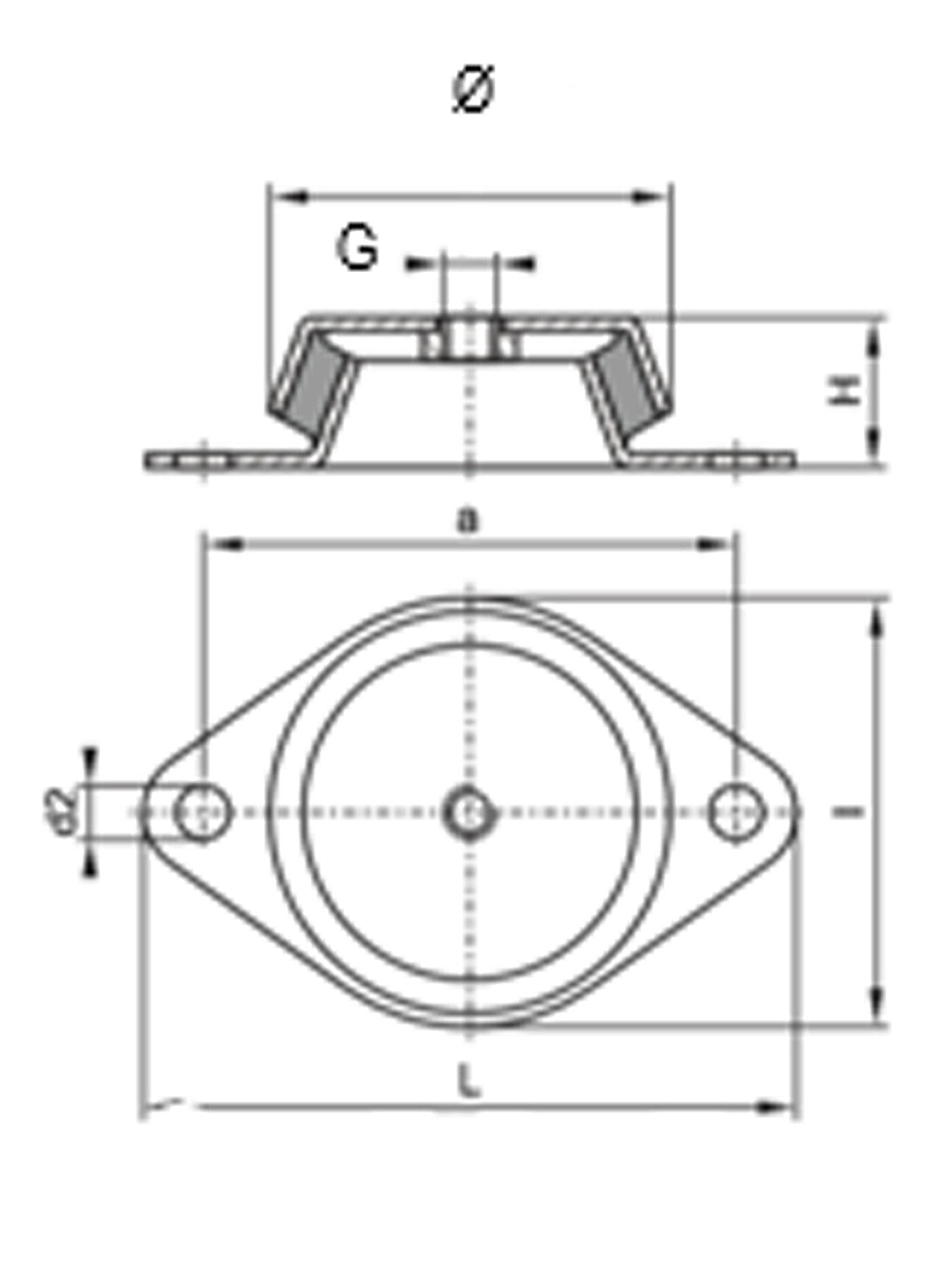 | Bezeichnung | Artikelnummer | G | h(mm) | l(mm) | a(mm) | Ø2(mm) | L(mm) | Ø | Ausführung | Shorehärte A(+/- 5) | Belastung max.(daN) |