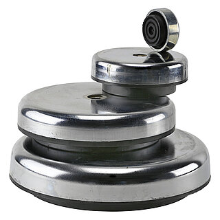 Das einvulkanisierte Elastomer mit konzentrischer Gleitschutzprofilierung verringert die Neigung zum Wandern der Maschine bei hohen Horizontalkräften. Durch die galvanische Oberflächenveredelung ist ein zuverlässiger Korrosionsschutz geboten.