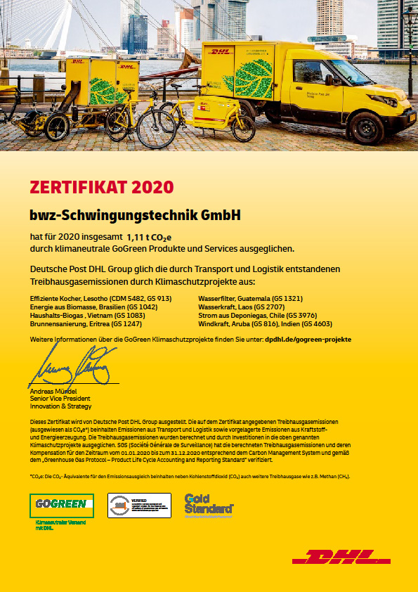 Den Paketversand mit dem DHL-Produkt GOGREEN gibt es bei bwz® Schwingungstechnik seit 2018.
